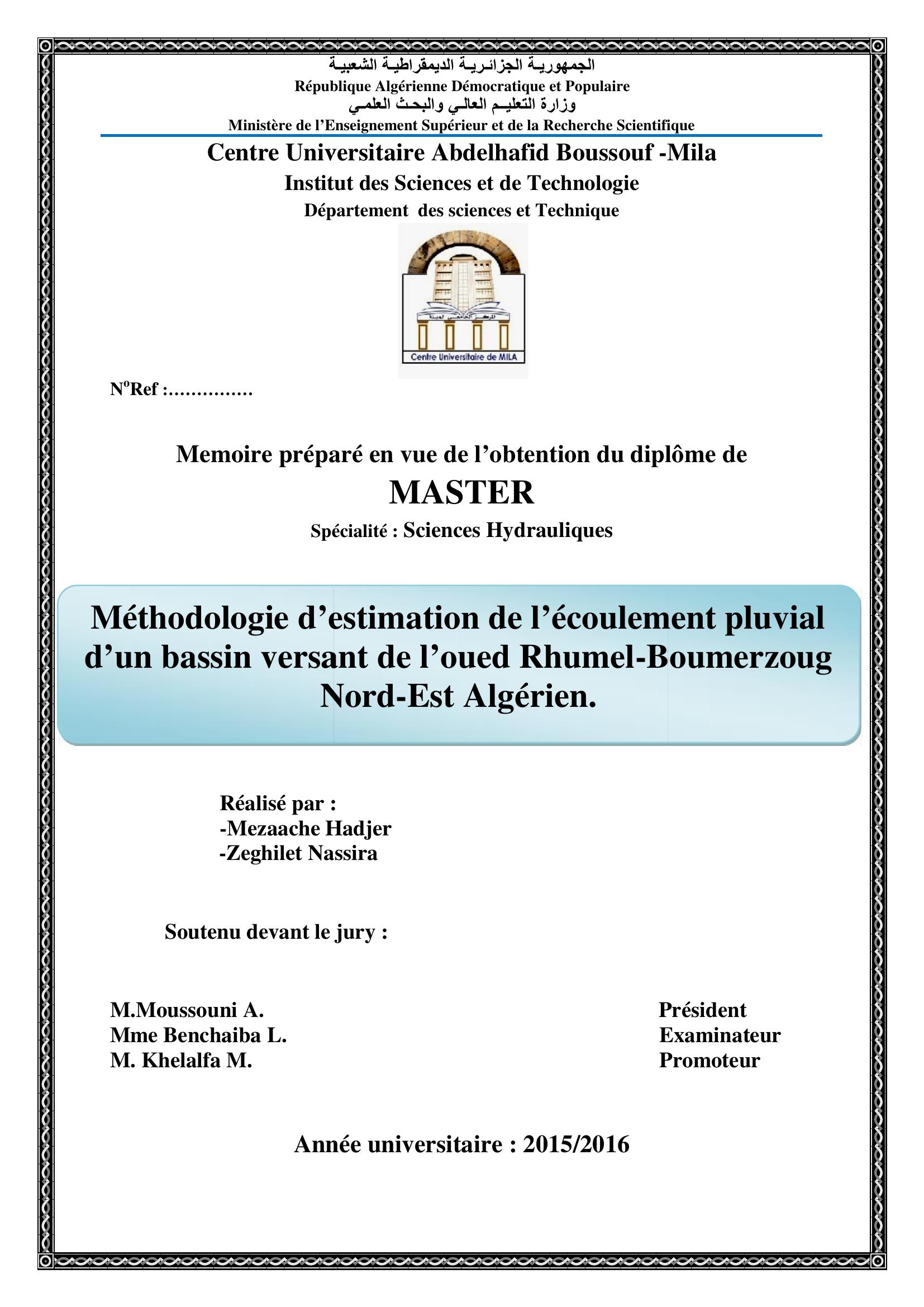mezaache hadjer & Moussouni A.Président, B. (2016). méthodologie d'estimation de l'écoulement pluvial d'un bassin versant de l'oued rhumel boumerzoug nord est algérien.