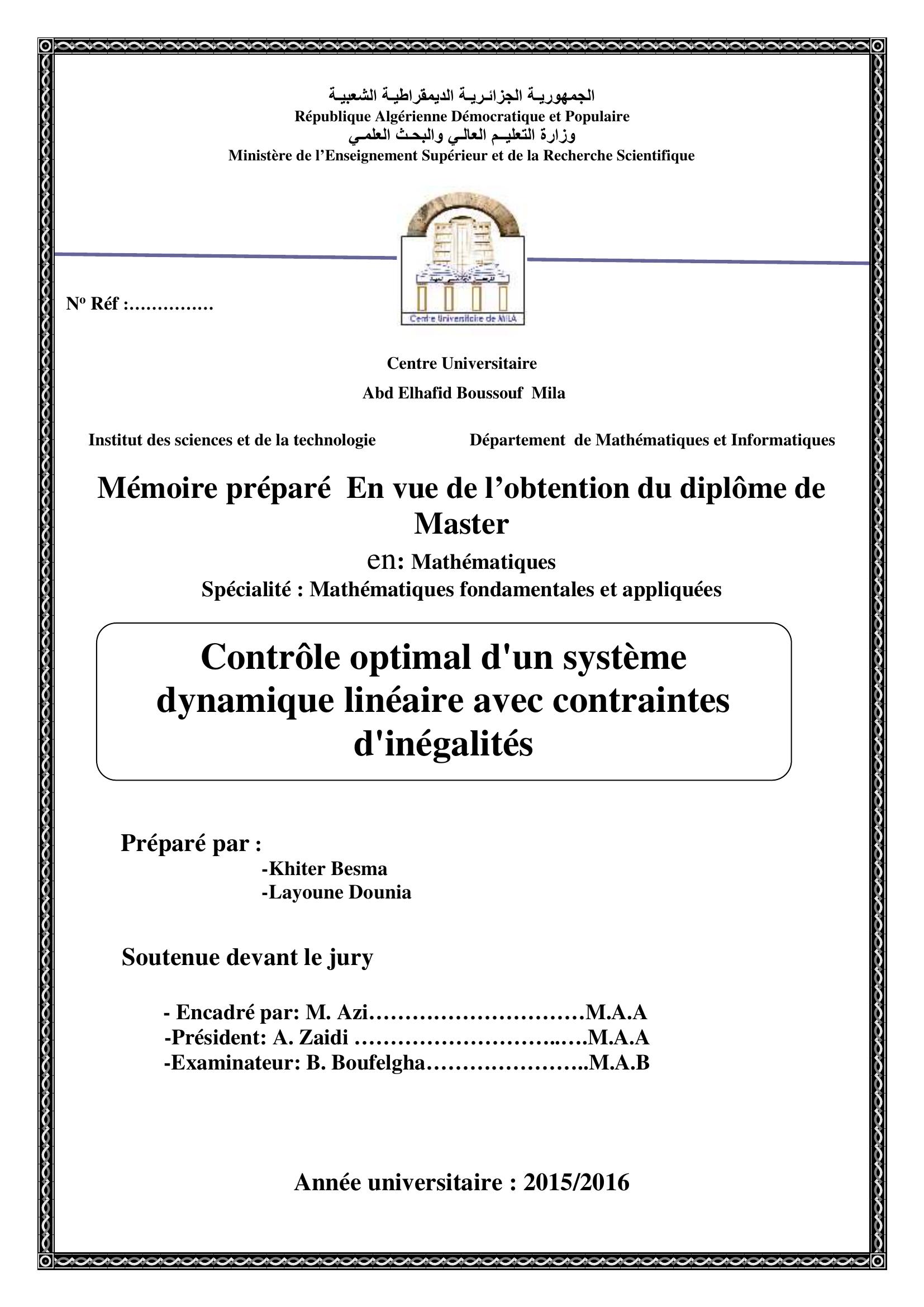 khiter besma & M. Azi encadreur, A. (2016). controle optimal d'un système dynamique linéaire avec contraintes d'inégalités.