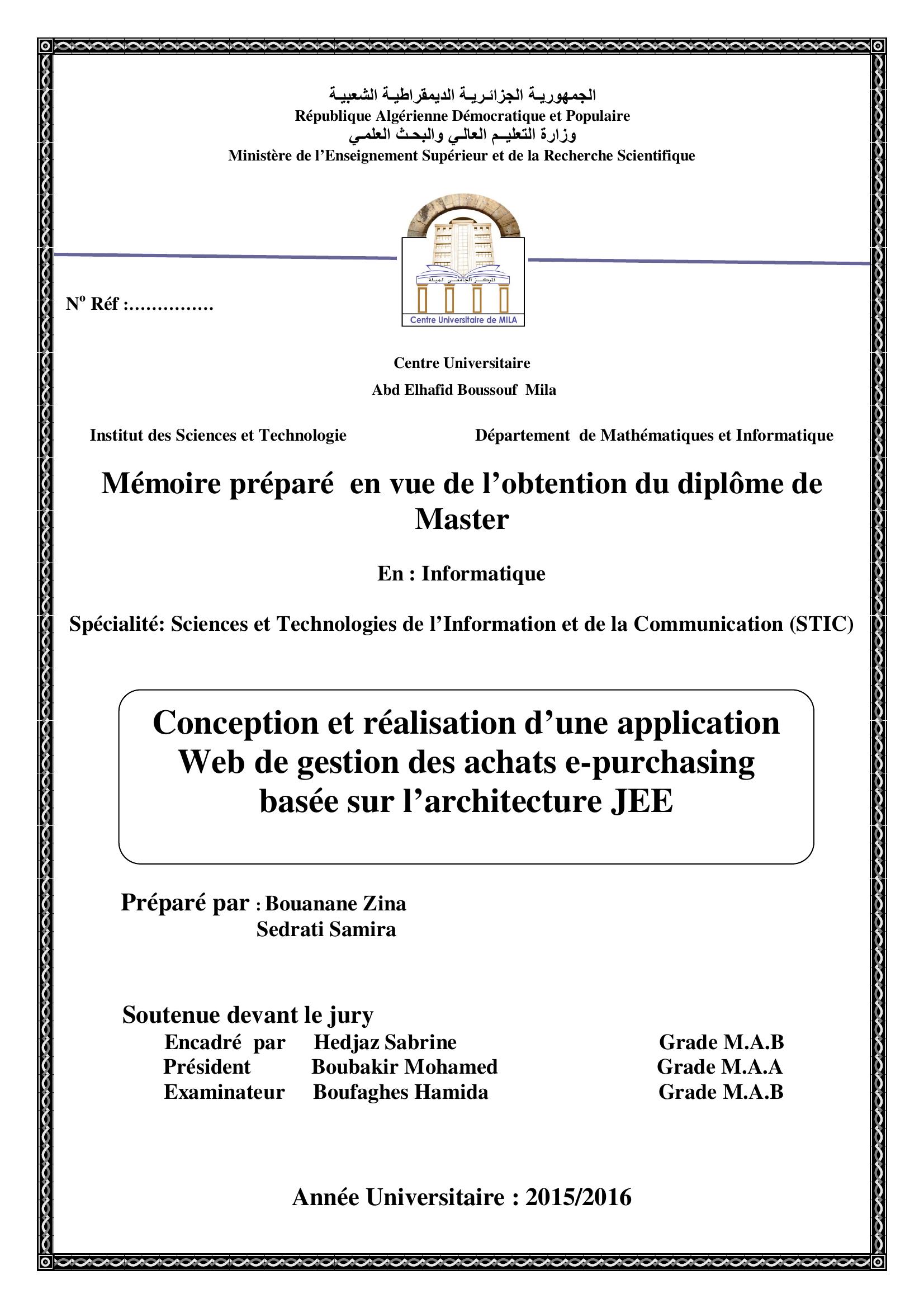 Bouanane Zina & Hedjaz Sabrine encadreur, B. (2016). conception et réalisation d'une application web de gestion des achats e-purchasing basée sur l'architecture jee.