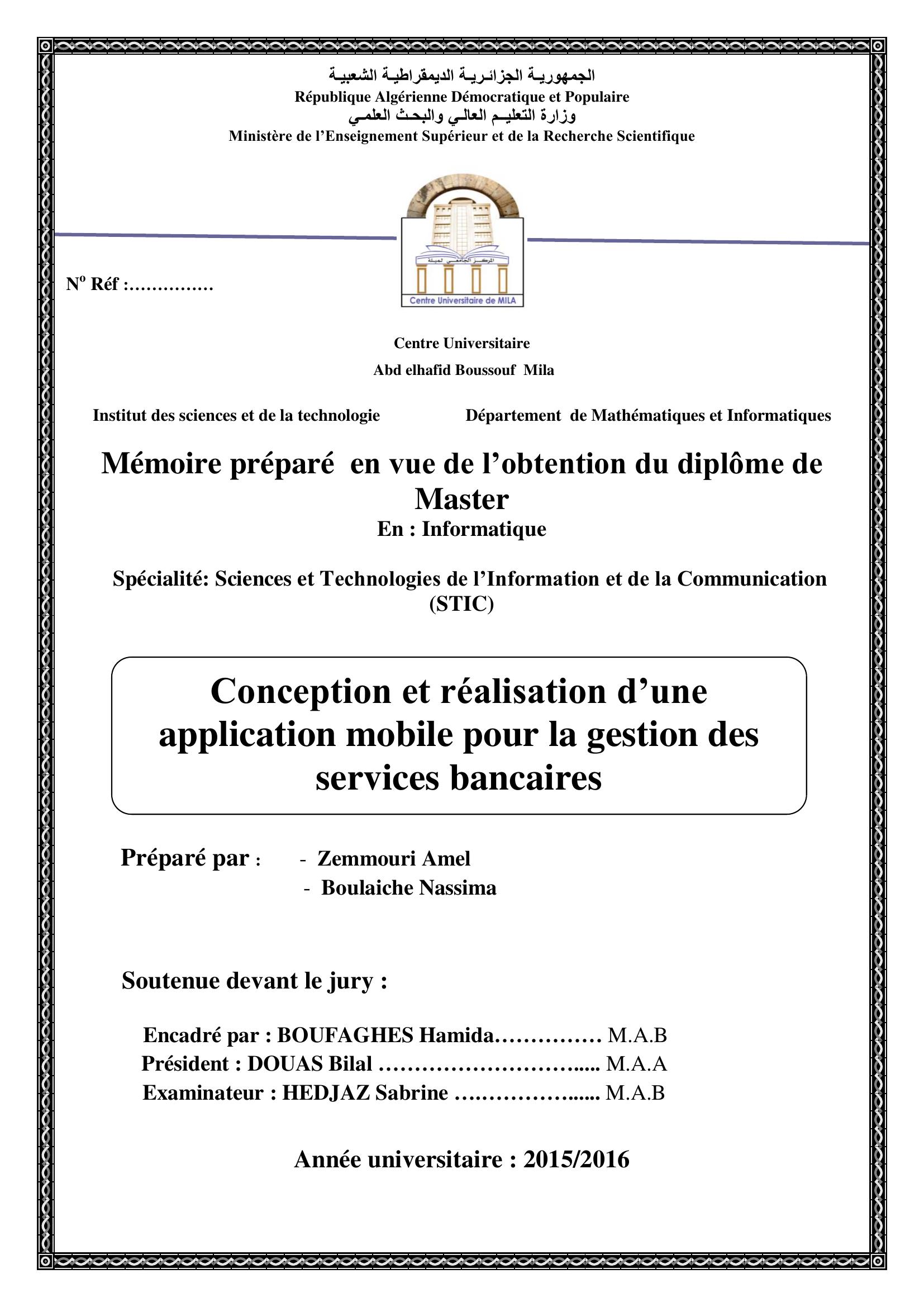 zemmouri amel & BOUFAGHES Hamida encadreur, D. (2016). conception et réalisation d'une application mobile pour la gestion des services bancaires.