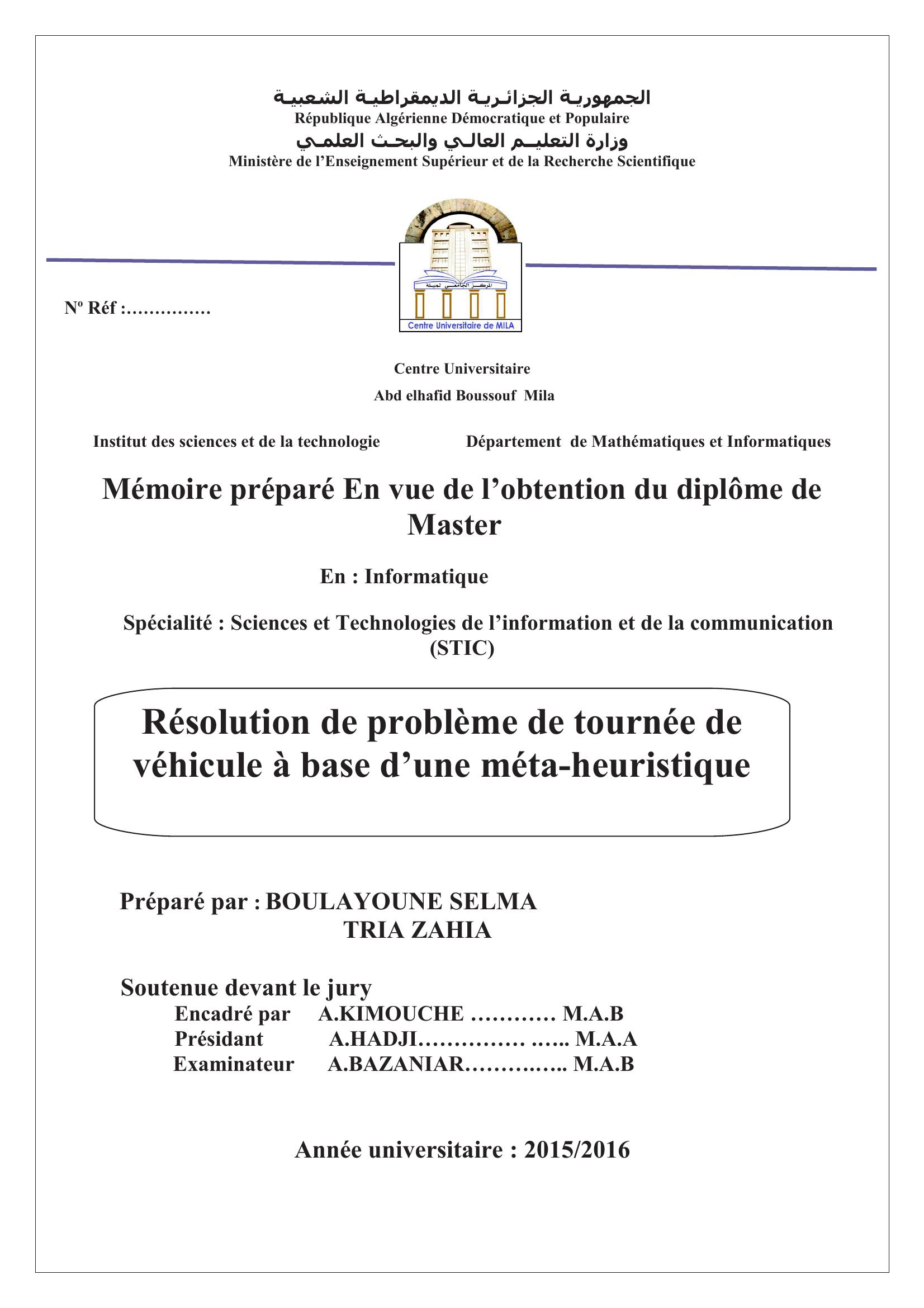 boulayoune selma & A kimouche encadreur, A. (2016). résolution de problème de tournée de véhicule à base d'une méta-heuristique.