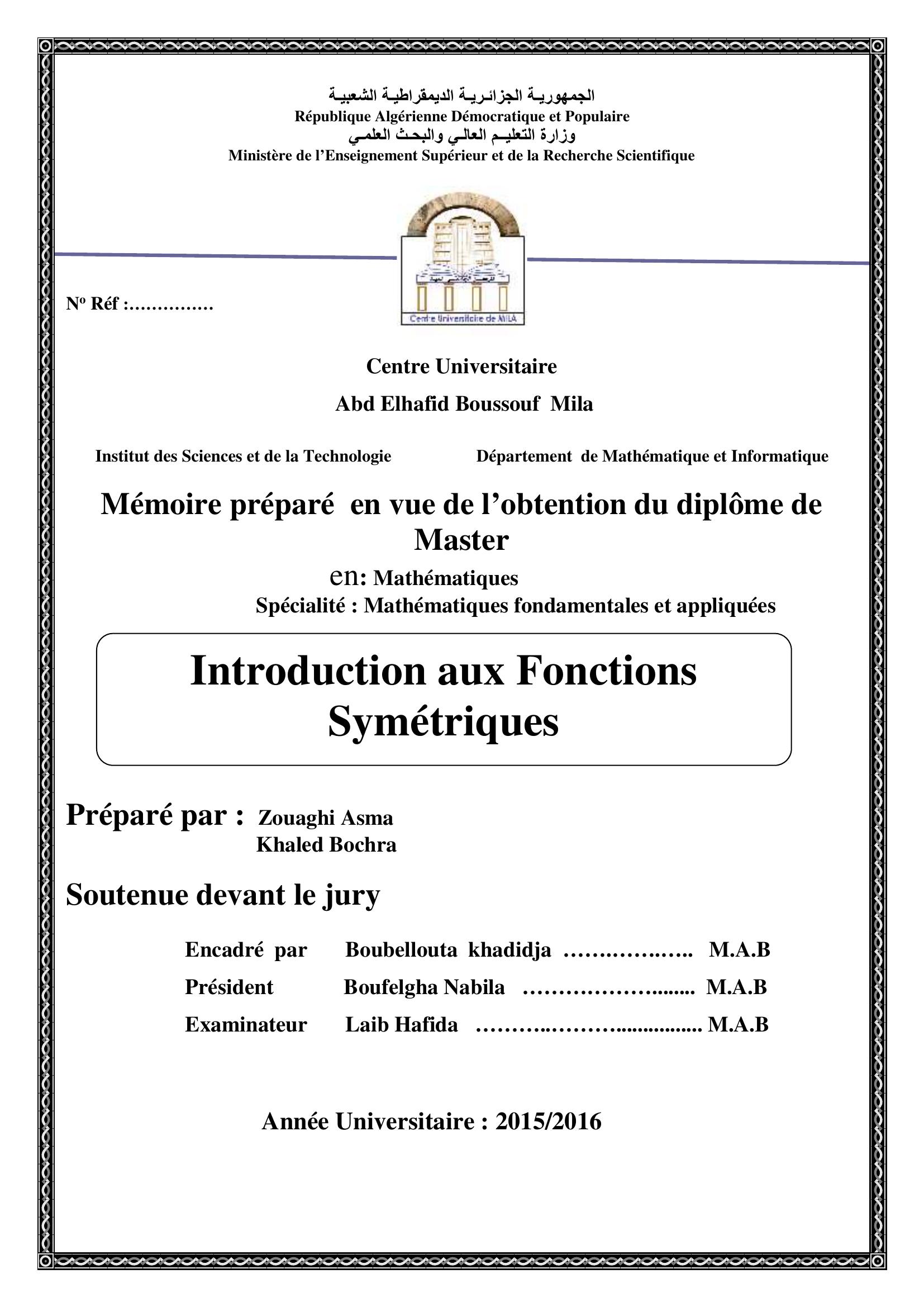 Zouaghi, a. & Boubellouta khadidja (encadreur), B. (2016). Introduction aux fonctions symétriques.