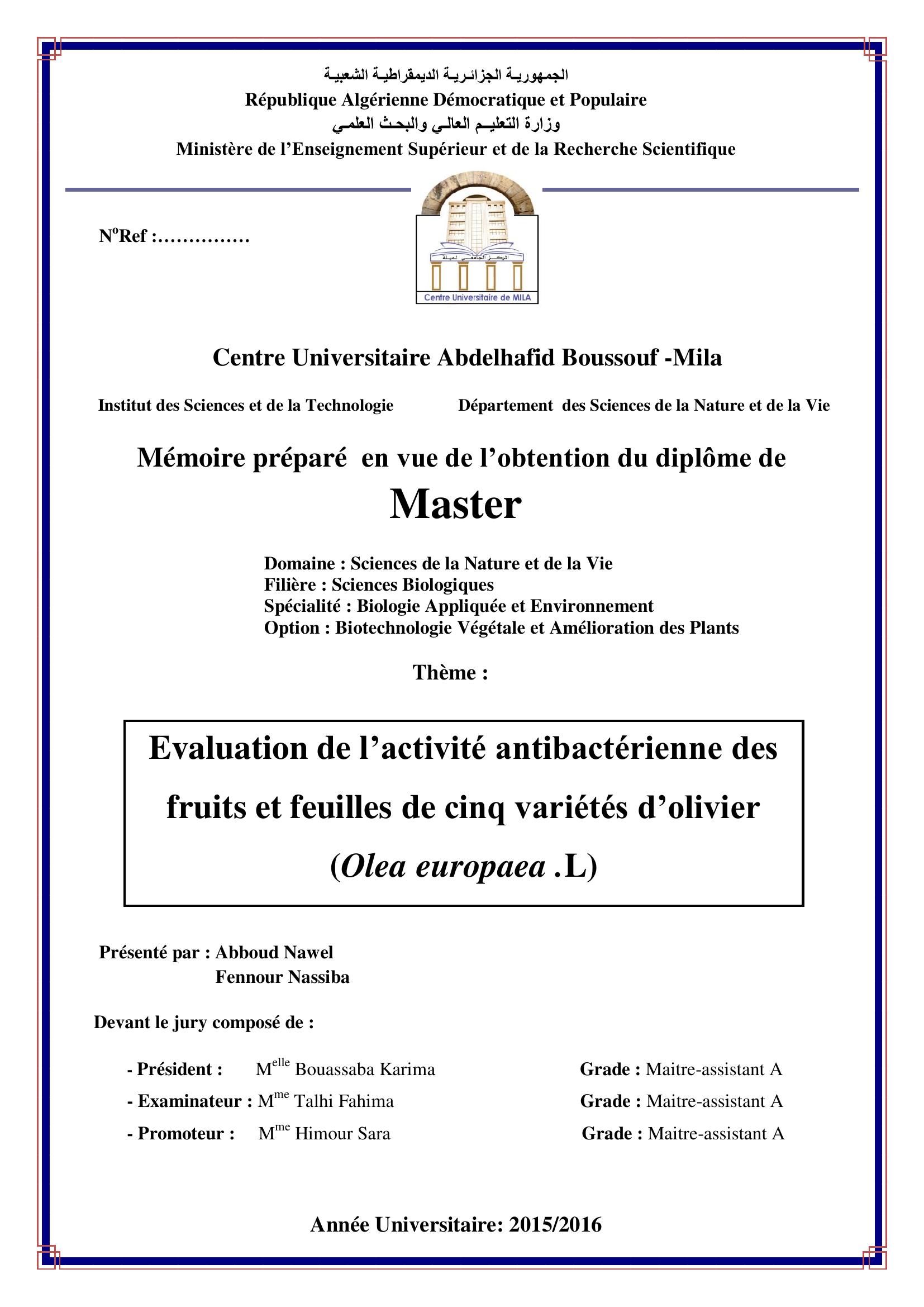 Evaluation de l'activité antibactérienne des fruits et feuilles de cinq variétés d'olivier (olea europaea. l)