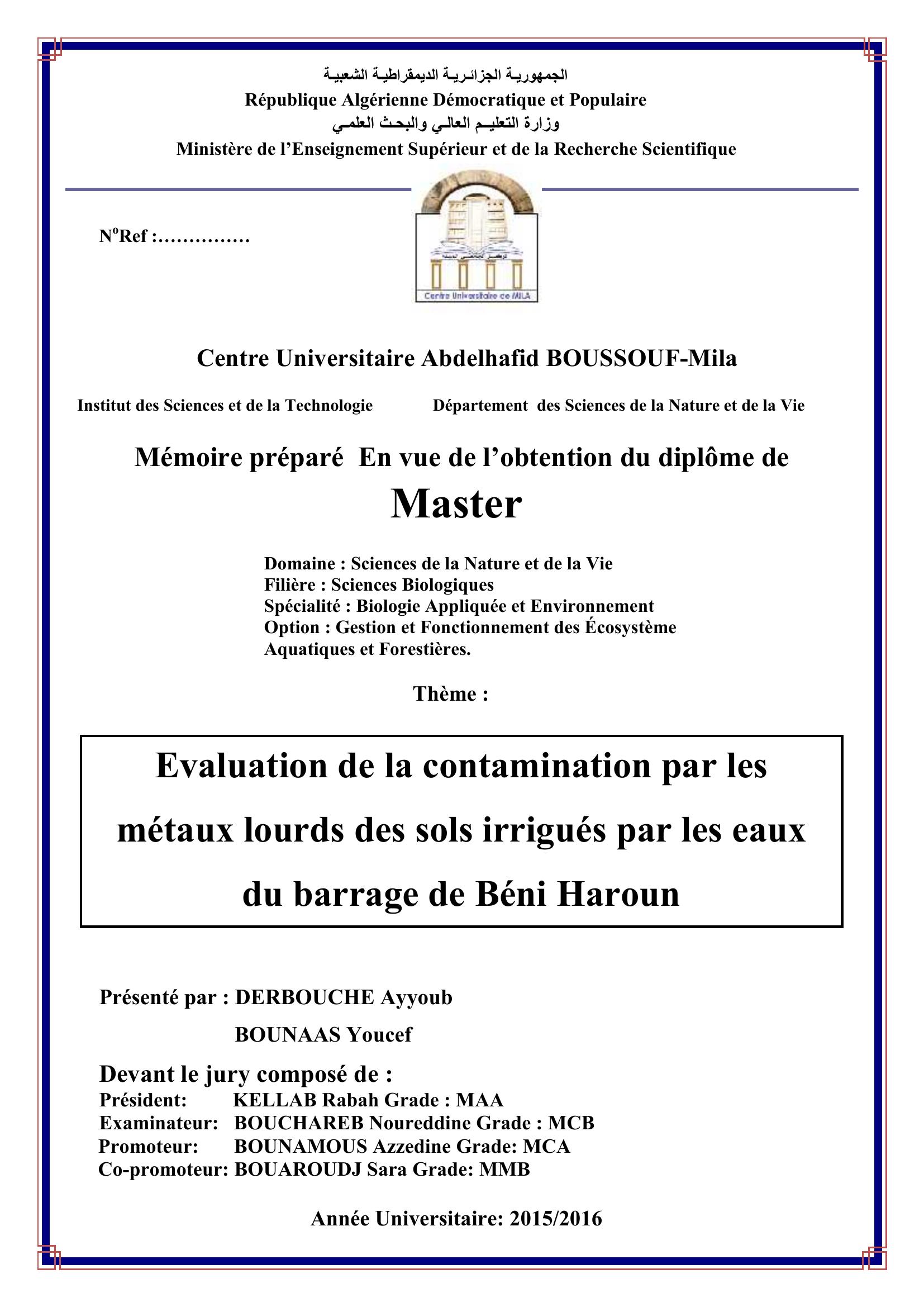 derbouche ayyoub & KELLAB Rabah Président, B. (2016). Evaluation de la contamination par les métaux lourds des sols irrigués par les eaux du barrage de béni haroun.