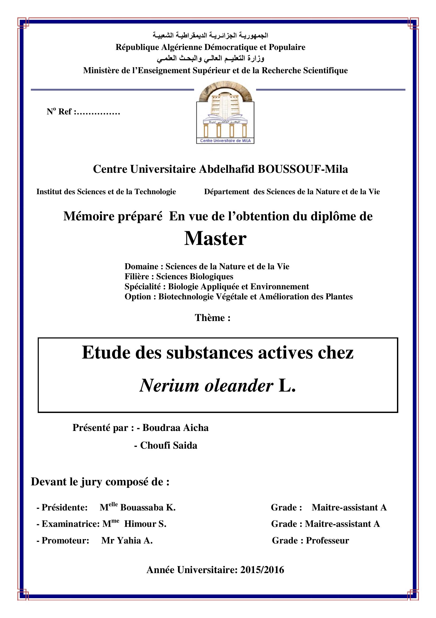 boudaa aicha & Bouassaba K Présidente, H. (2016). Etude des substances actives chez nerium oleander L.