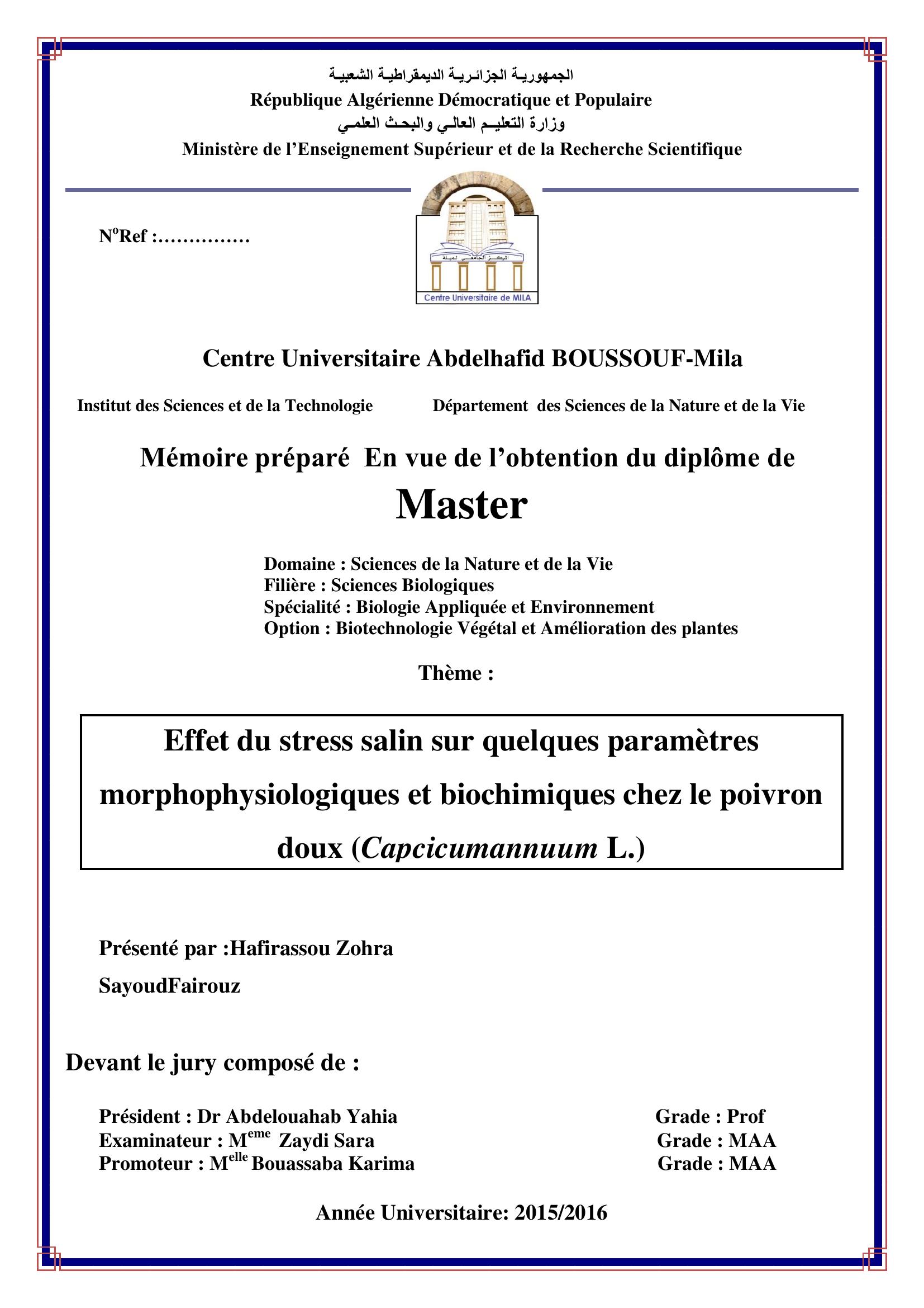 hafirassou zohra & Abdelouahab Yahia Président, Z. (2016). Effet du stress salin sur quelques paramétres morphophsiologiques et biochimiques chez le poivron doux (capcicumannuumm L).