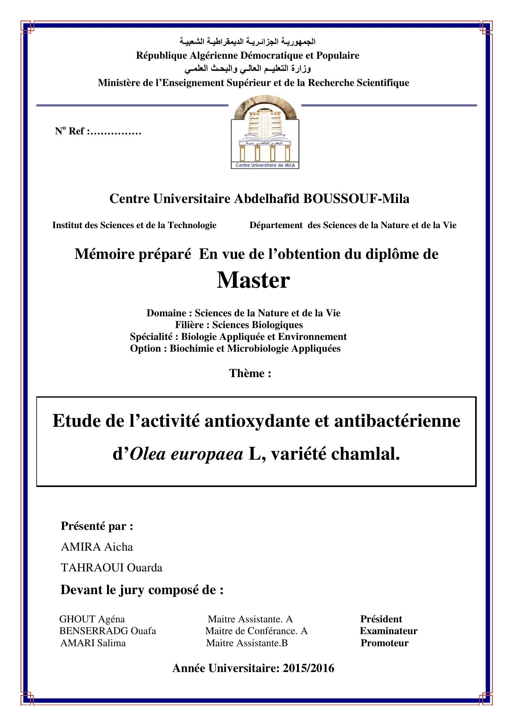 amira aicha & GHOUT Agéna Président, B. (2016). etude de l'activité antioxydante et antibactérienne d'olea europaea L , variété chamlal.