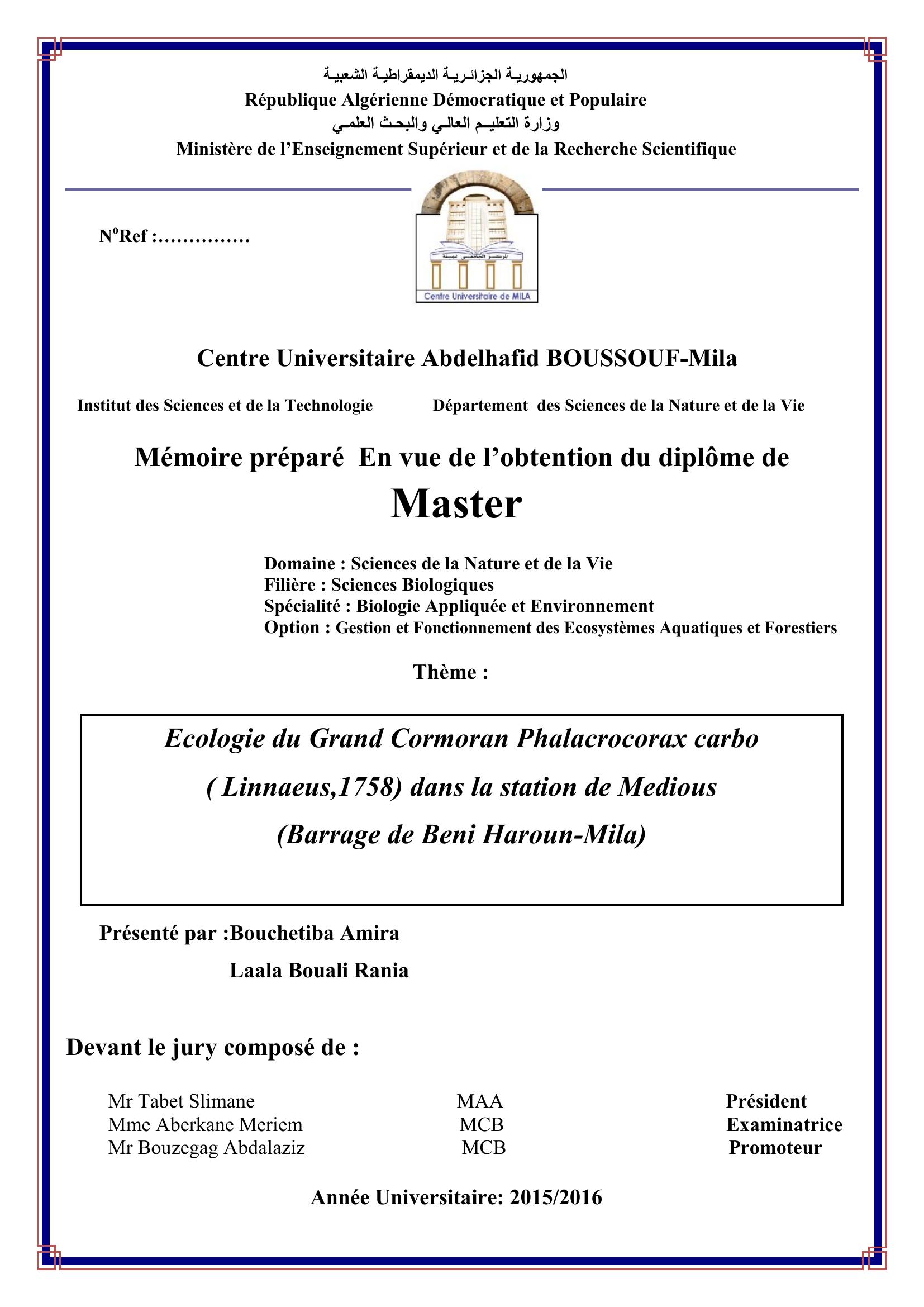 bouchetiba amira & Tabet Slimane Président, A. (2016). ecologie du grand cormoran phalacrocorax carbo (linnaeus,1758) dans la station de medious (barrage de beni haroun-mila).