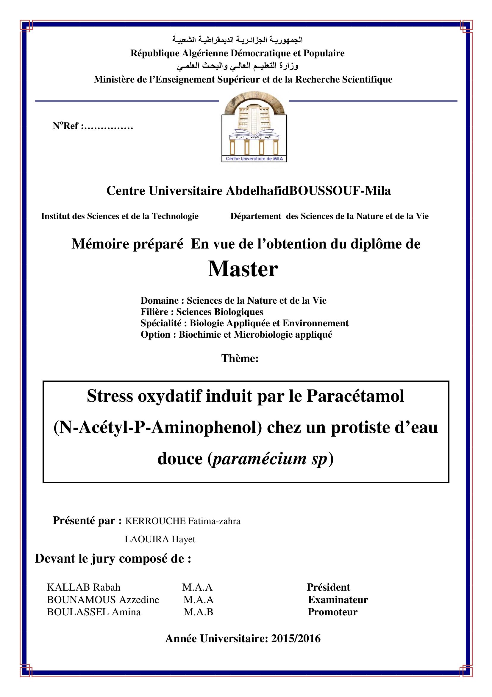 kerrouce fatima-zahra & KALLAB Rabah Président, B. (2016). stress oxydatif induit par le paracétamol (N- Acétyl - P-Aminophenol) chez un protiste d'eau douce (paramécium sp).