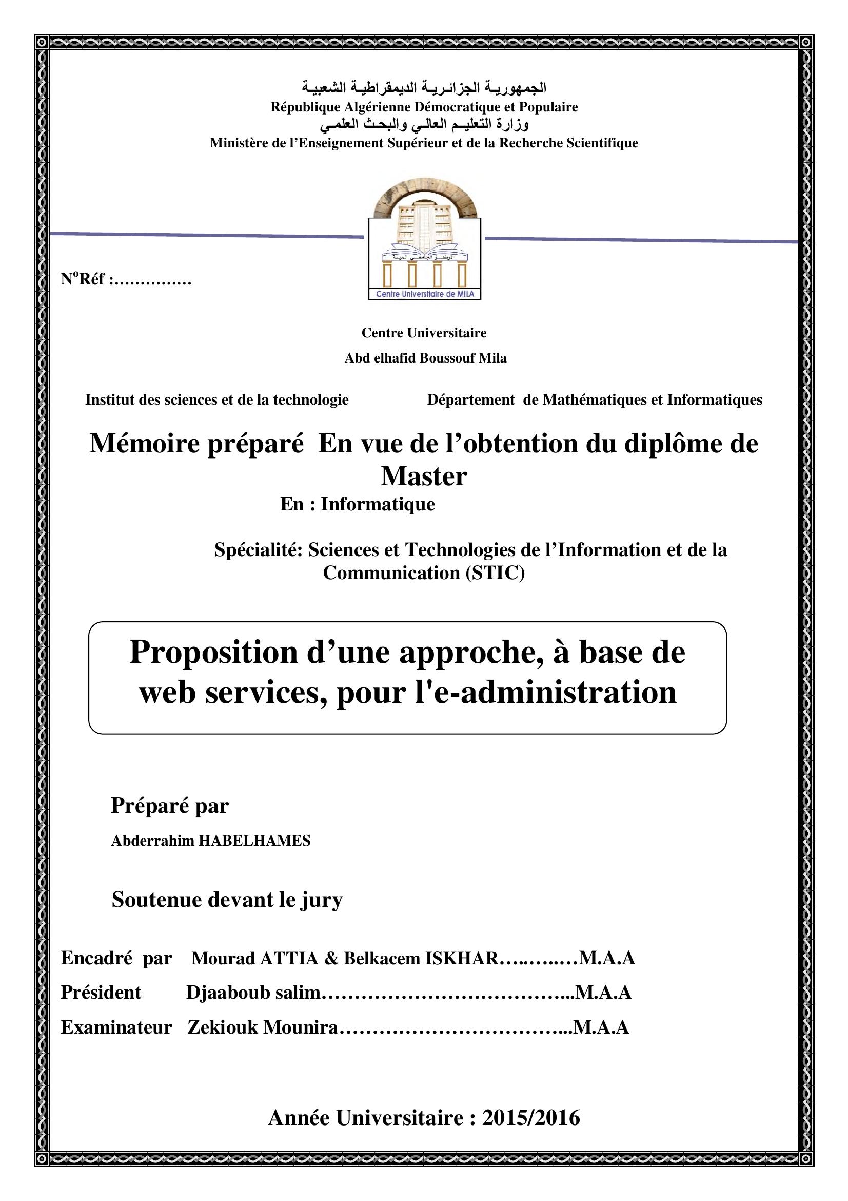 habelhames abderrahim & Mourad ATTIA & Belkacem ISKHAR encadreur, D. (2016). Proposition d'une approche , à base de web services , pour l'e-administration.