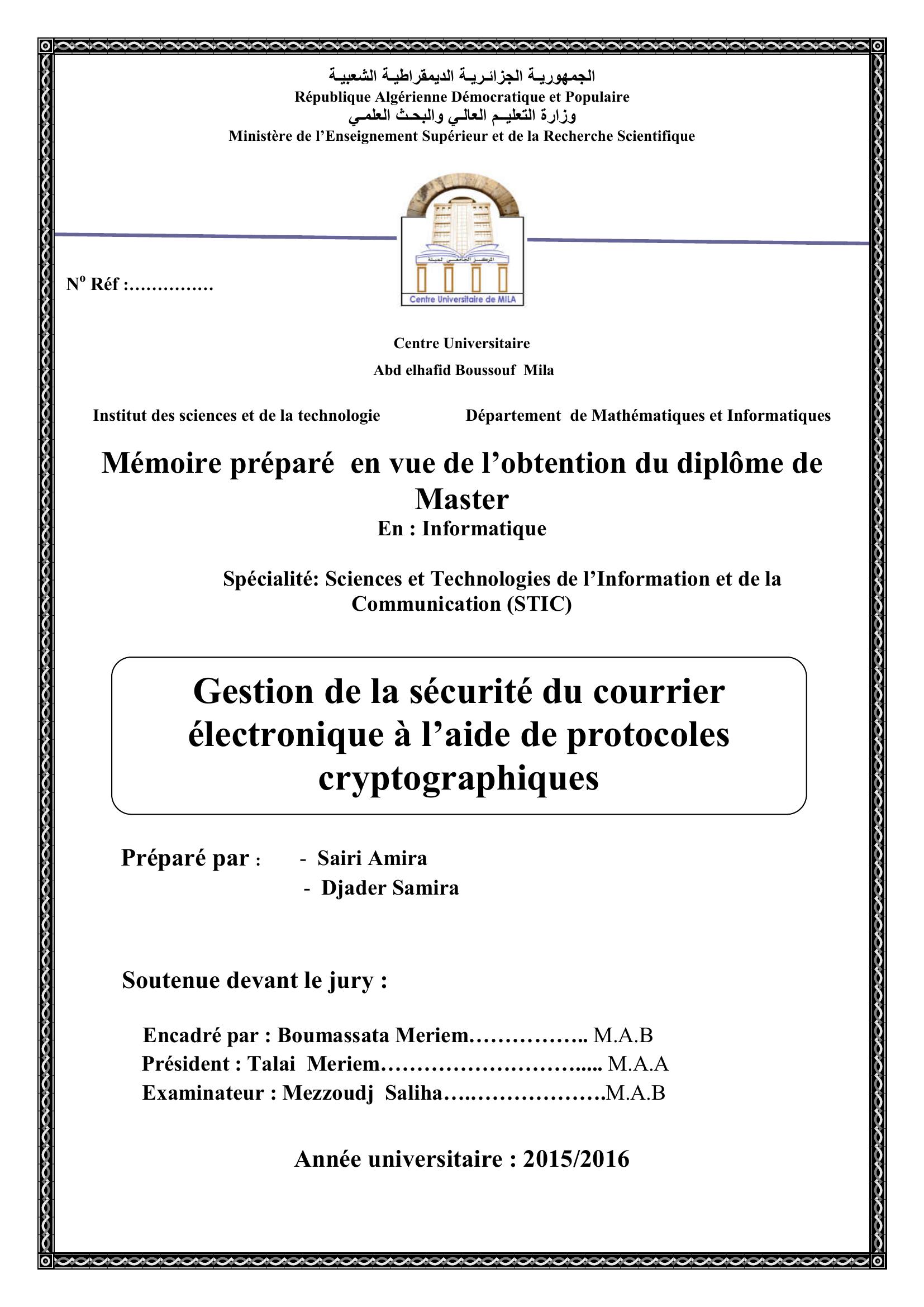 Sairi Amira & Boumassata Meriem encadreur, T. (2016). gestion de la sécurité du courrier électronique à l'aide de protocoles cryptographiques.