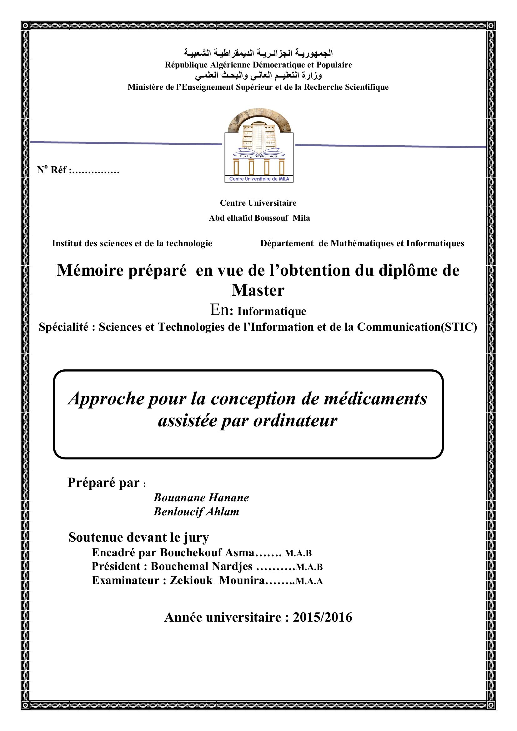 bouanane hanane & Bouchekouf Asma encadreur, B. (2016). Approche pour la conception de médicaments assistée par ordinateur.