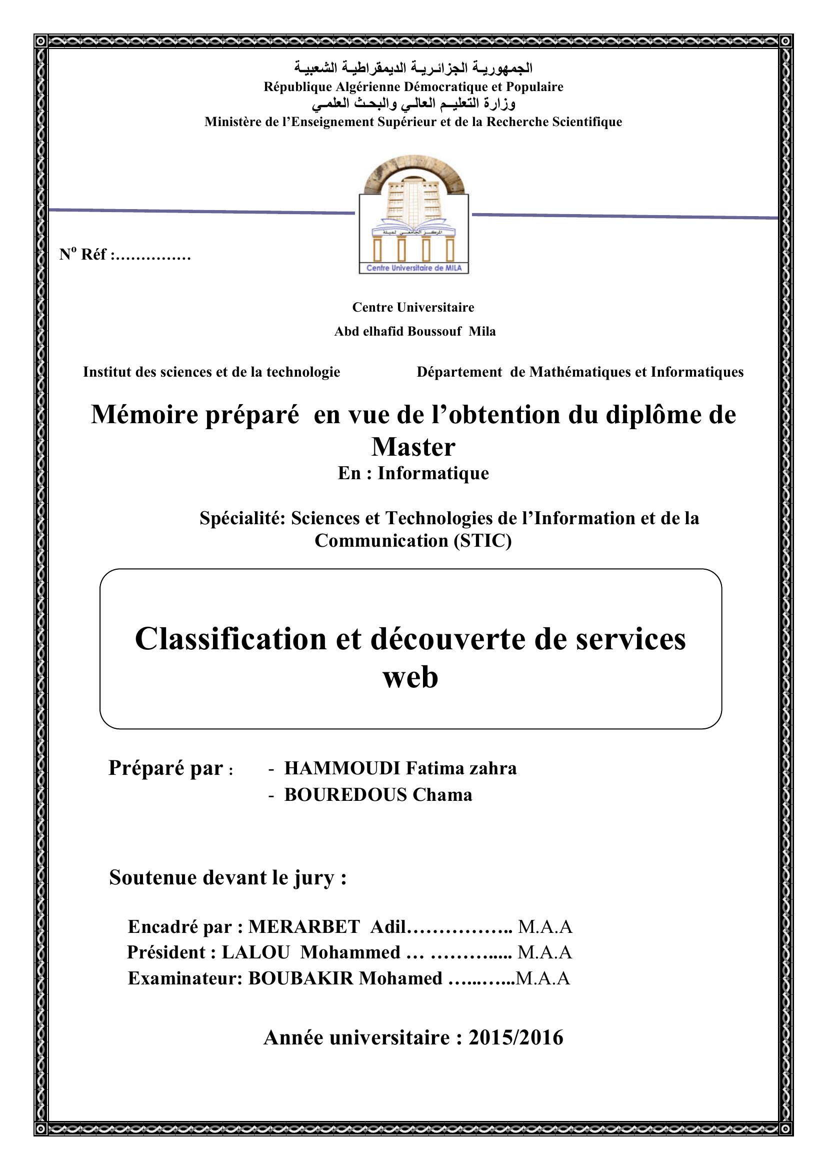 hammoudi fatima zahra & MERARBET Adil encadreur, L. (2016). classification et découverte de services web.