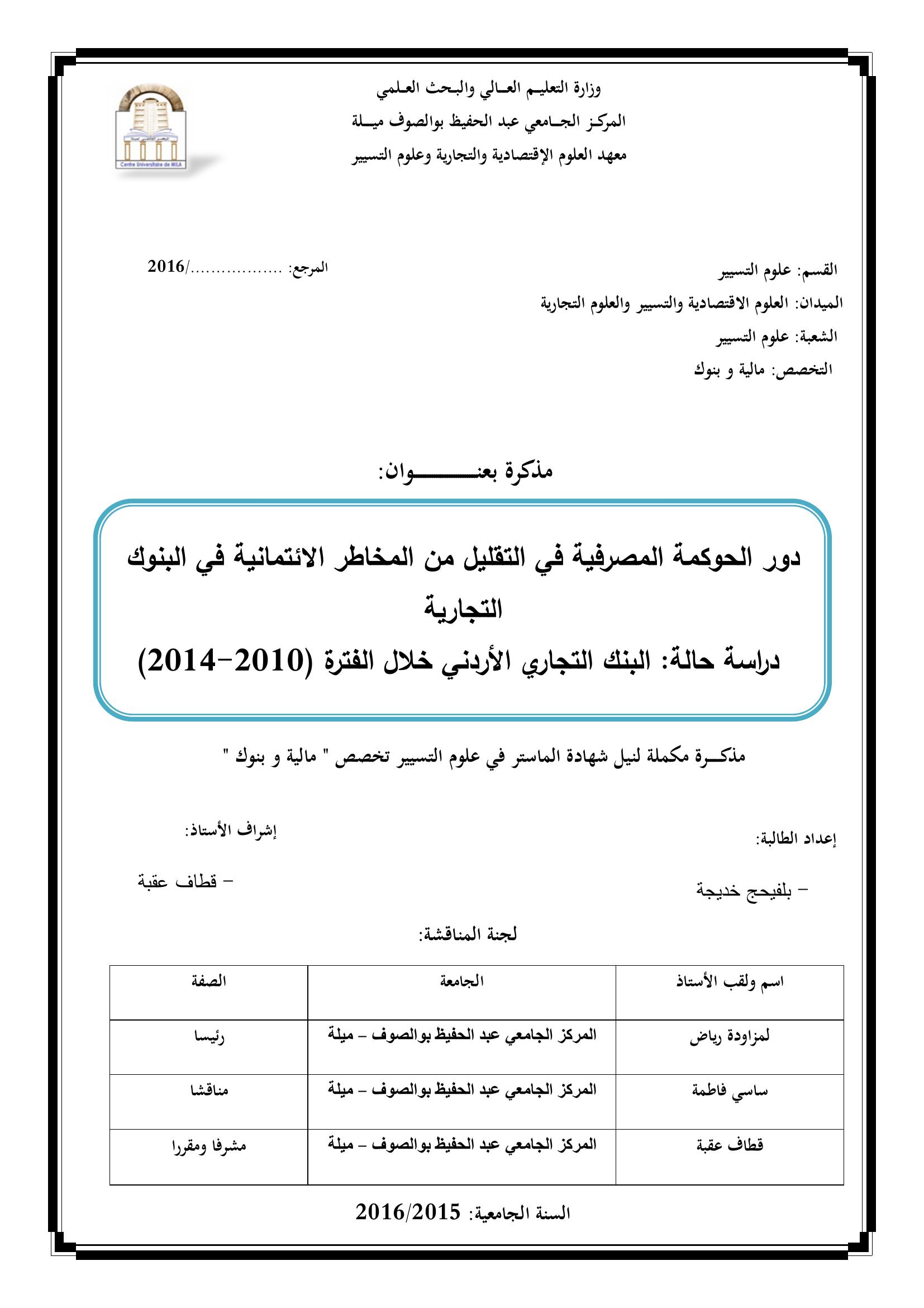 بلفيحج خديجة & ،لمزاودة رياض(رئيسا)، ساسي فاطمة(مناقشا)، قطاف عقبة(مشرفا ومقررا) (2016). دور الحوكمة المصرفية في التقليل من المخاطر الئتمانية في البنوك : دراسة حالة البنك التجاري الأردني خلال الفترة (2010-2014).