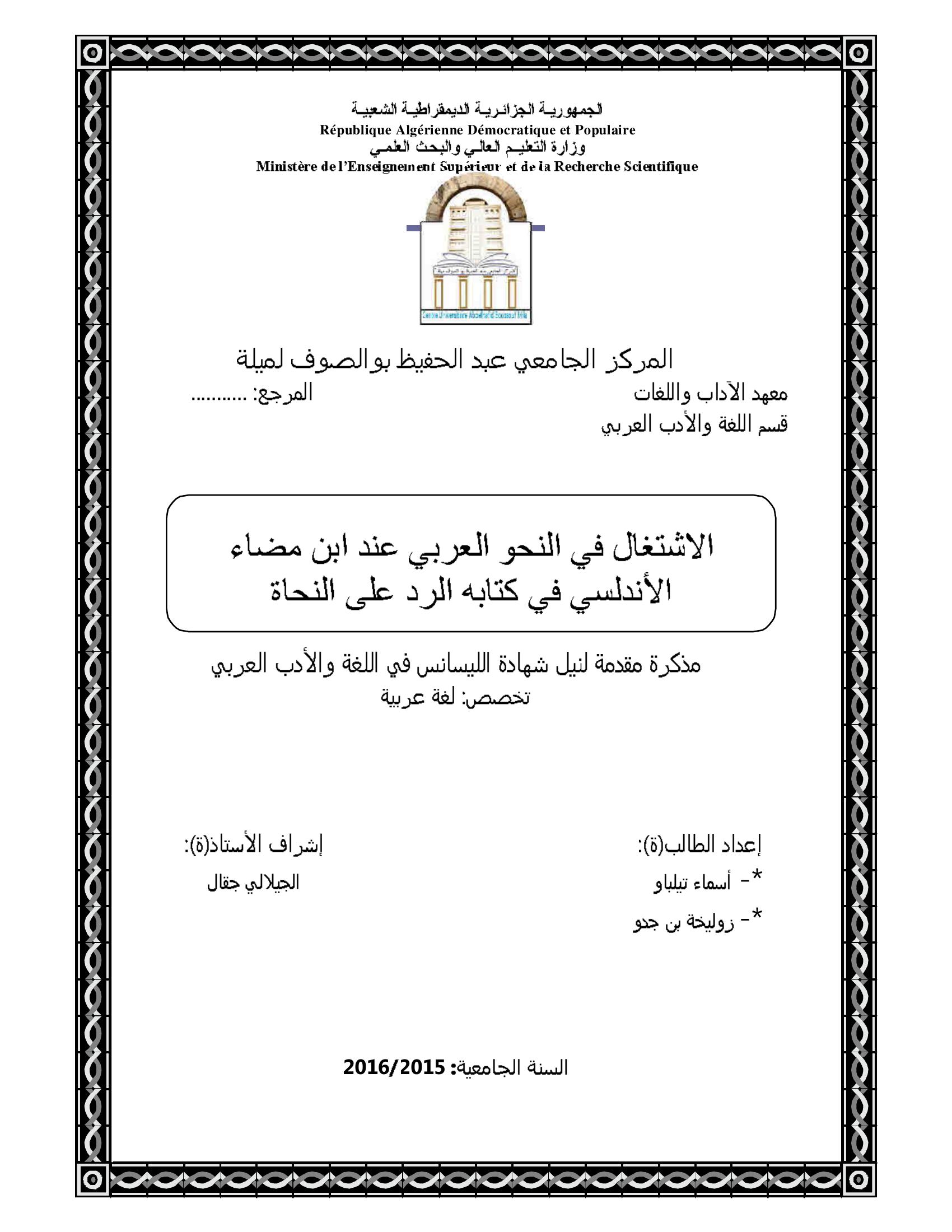 تيلباو أسماء et al. (2016). الإشتغال في النحو العربي عند ابن مضاء الأندلسي في كتابه الرد على النحاة.