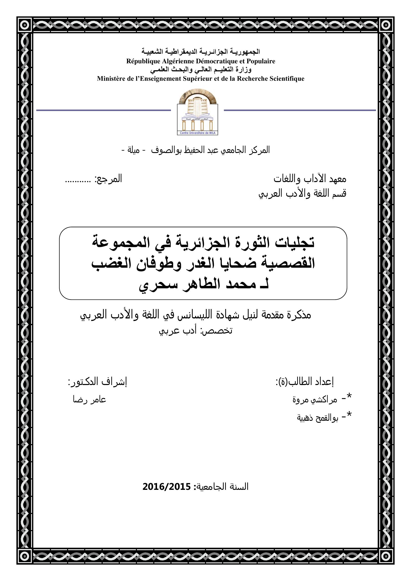 مراكشي مروة et al. (2016). تجليات الثورة الجزائرية في المجموعة القصصية ضحايا الغدر وطوفان الغضب لـ محمد الطاهر سحري.