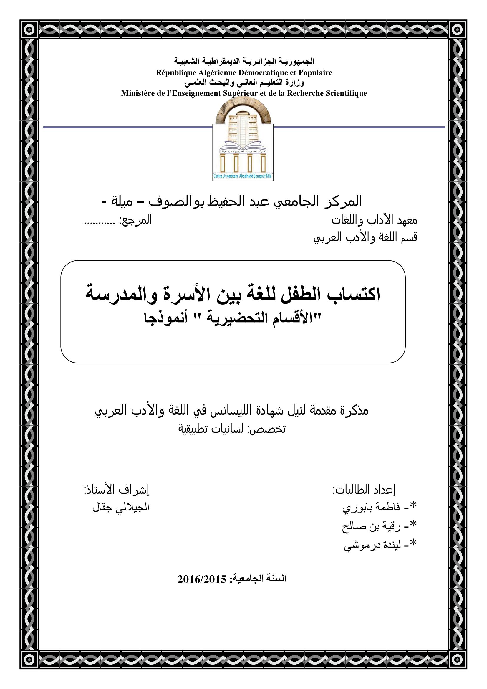 بابوري فاطمة et al. (2016). اكتساب الطفل للغة بين الأسرة والمدرسة " الأقسام التحضيرية أنموذجا".