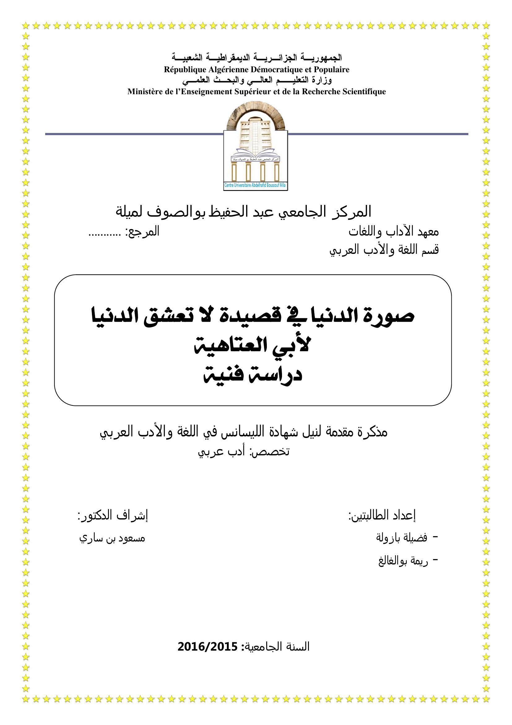 بازولة فضيلة et al. (2016). صورة الدنيا في قصيدة لا تعشق الدنيا للأبي العتاهية دراسة فنية.