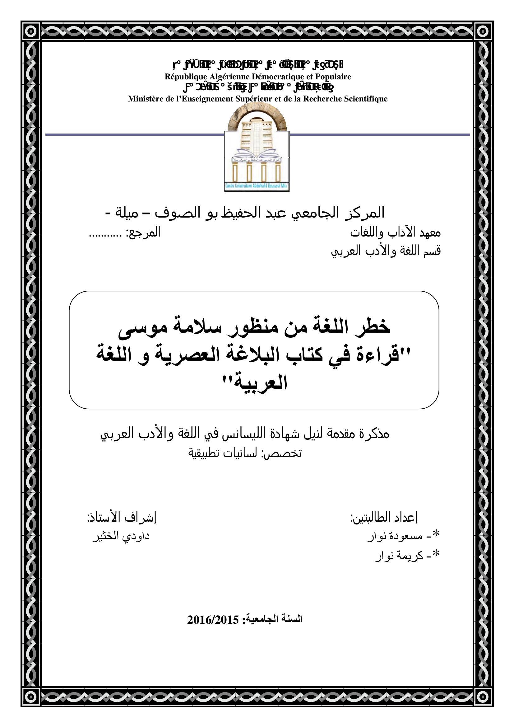 نوار مسعودة et al. (2016). خطر اللغة من منظور سلامة موسى قراءة في كتاب البلاغة العصرية واللغة العربية.
