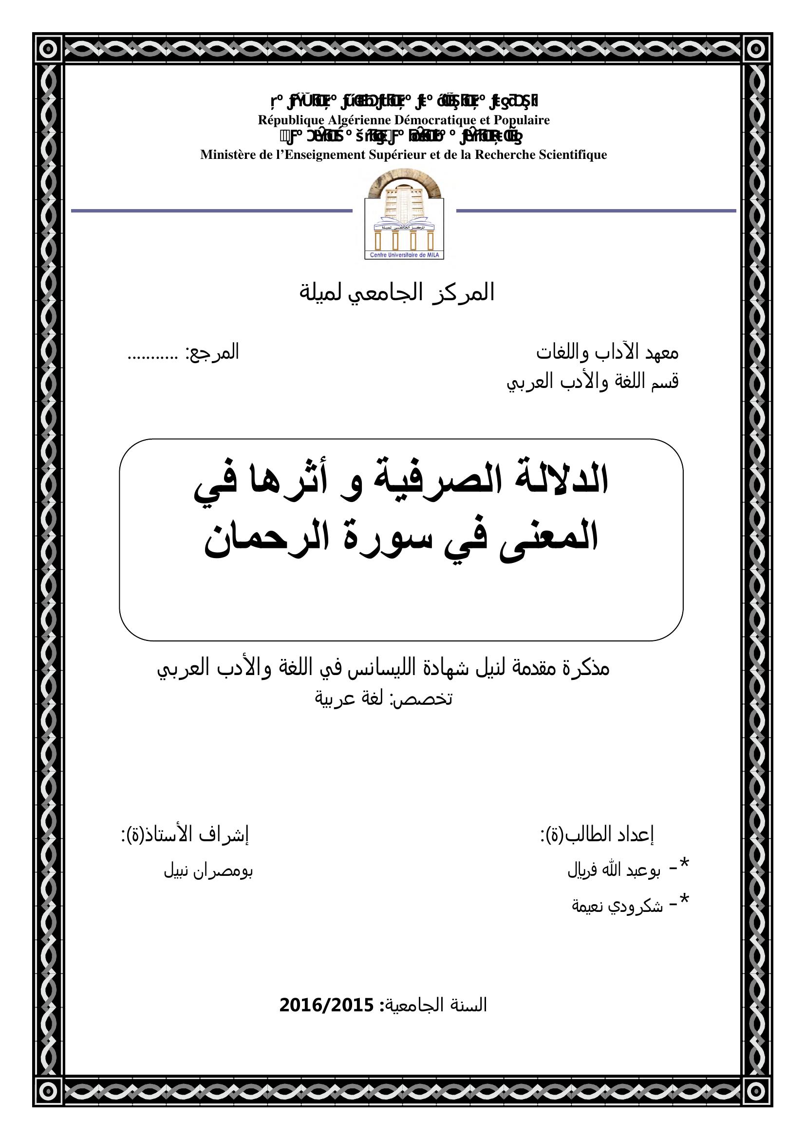 بوعبدالله فريال et al. (2016). الدلالة الصرفية وأثرها في المعنى في سورة الرحمان.