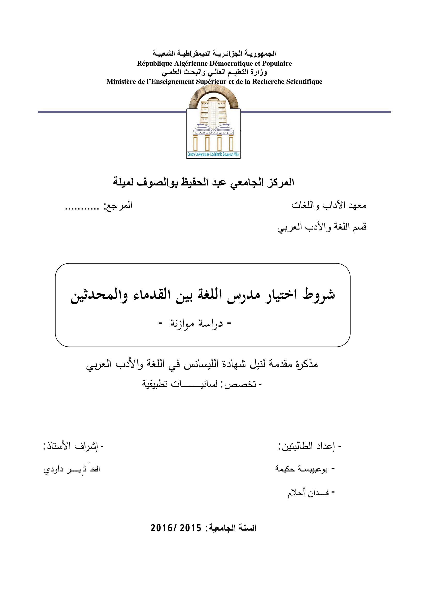 بوعبيسة حكيمة et al. (2016). شروط إختيار مدرس اللغة بين القدماء والمحدثين دراسة موازنة.