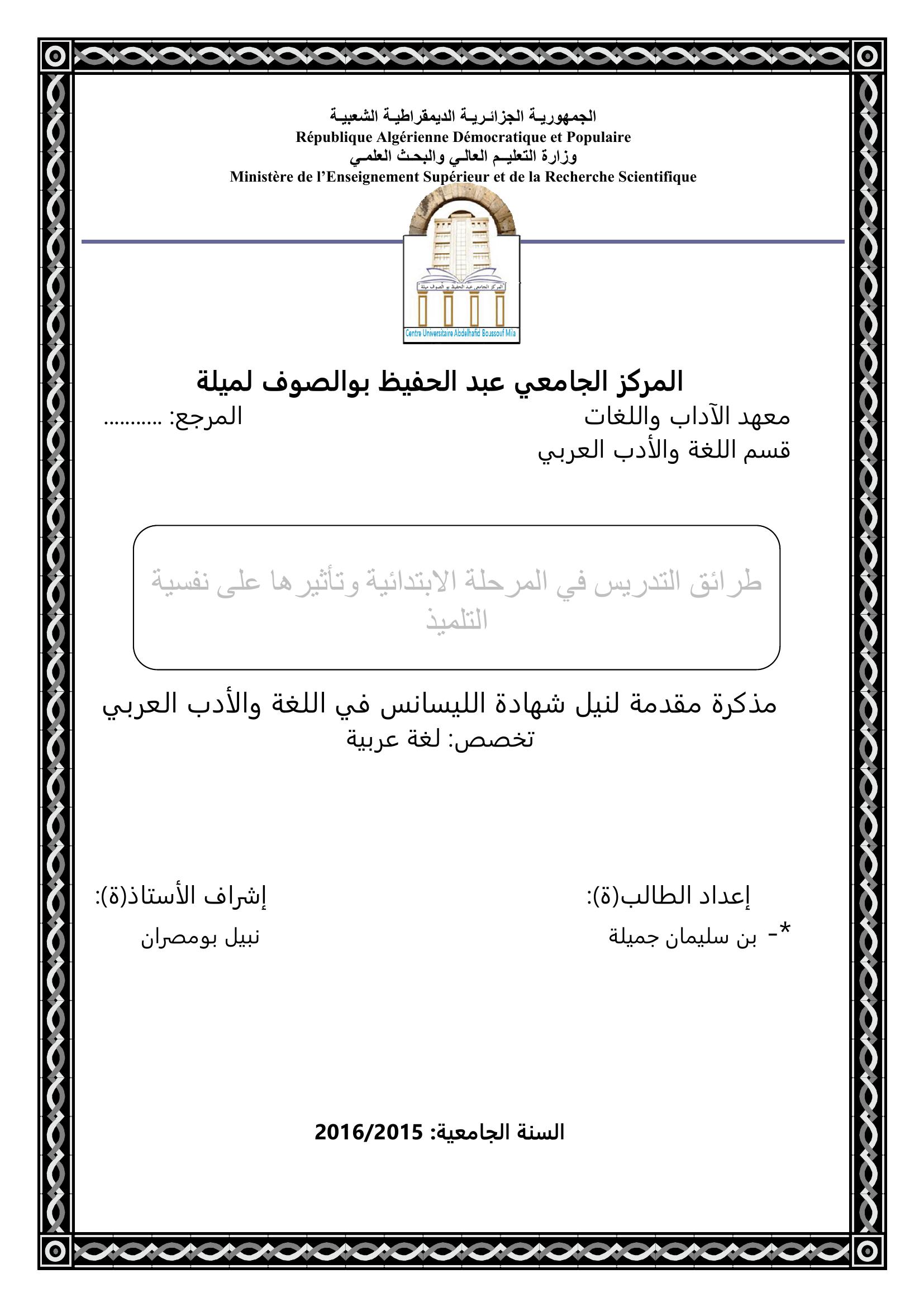 بن سليمان جميلة & بومصران نبيل (مشرفا) (2016). طرائق التدريس في المرحلة الإبتدائية وتأثيرها على نفسية التلميذ.