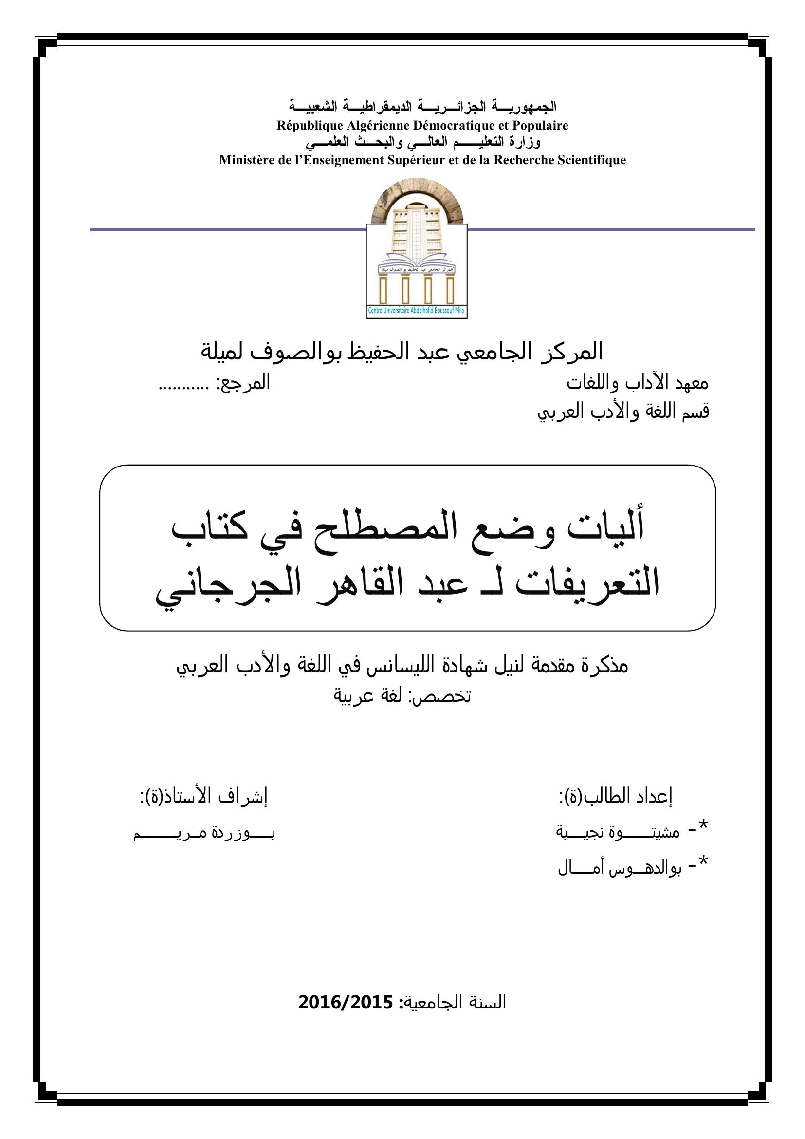 مشيتوة نجيبة et al. (2016). آليات وضع المصطلح في كتاب التعريفات لــ عبد القاهر الجرجاني.