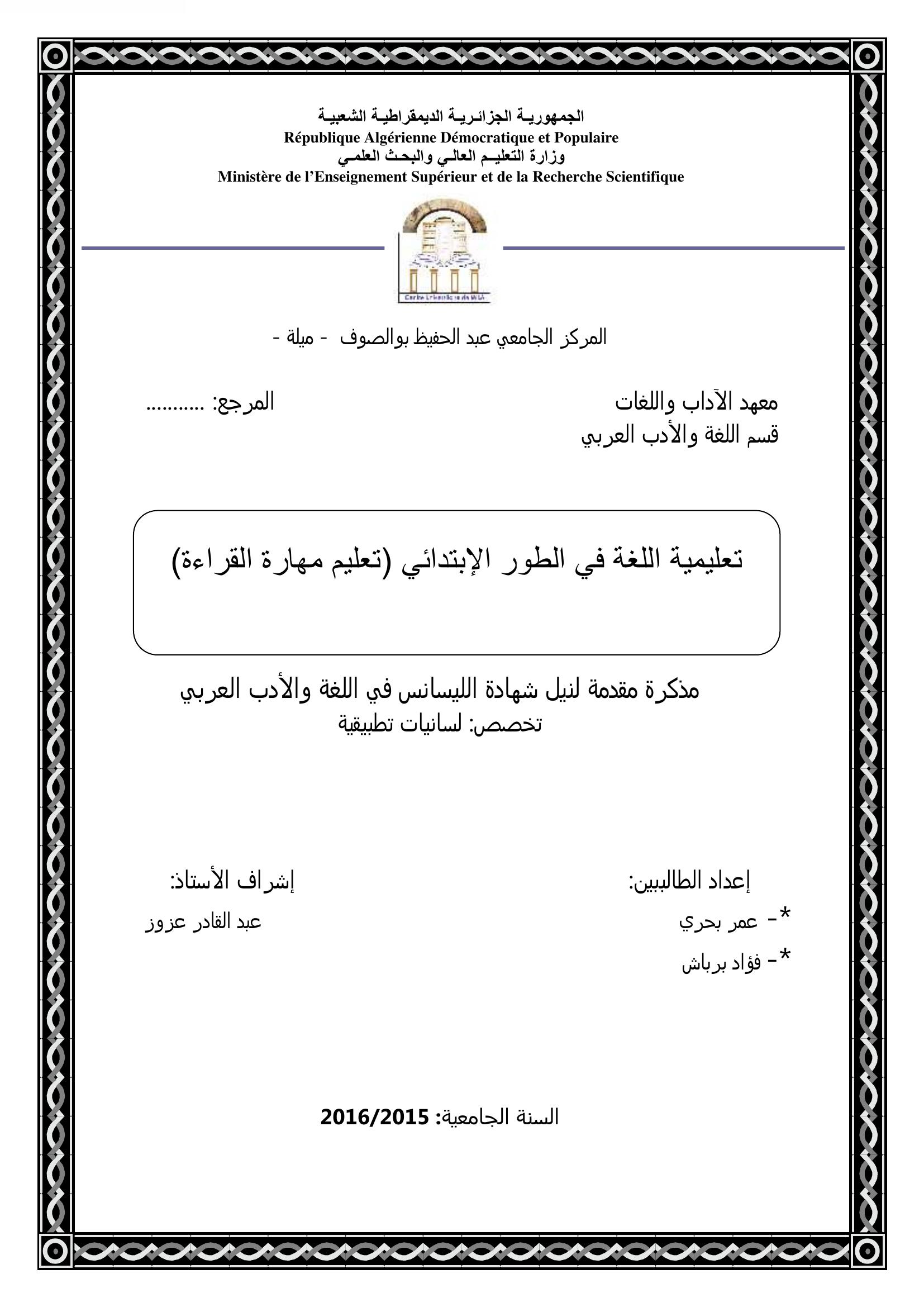 بحري عمر et al. (2016). تعليمية اللغة في الطور الإبتدائي (تعليم مهارة القراءة ) السنة الرابعة إبتدائي أنموذجا.