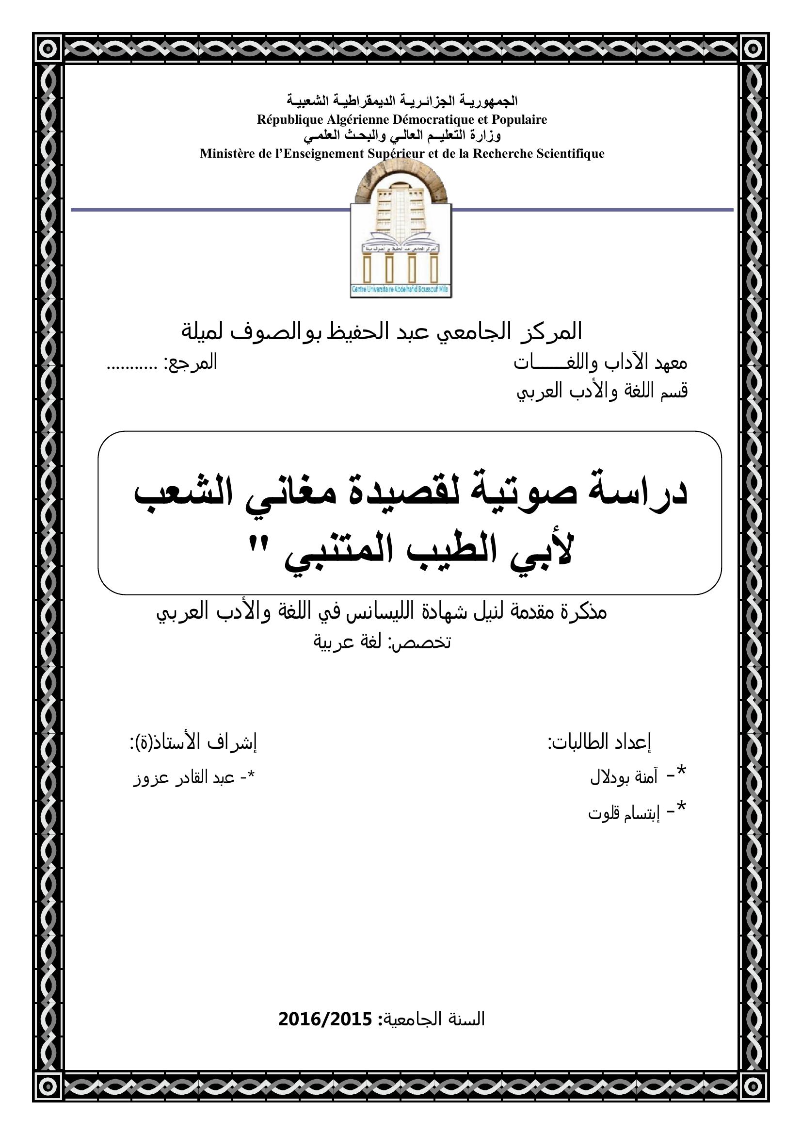بودلال آمنة et al. (2016). البناء الصوتي عند المتنبي "ديوان المتنبي نموذجا ".