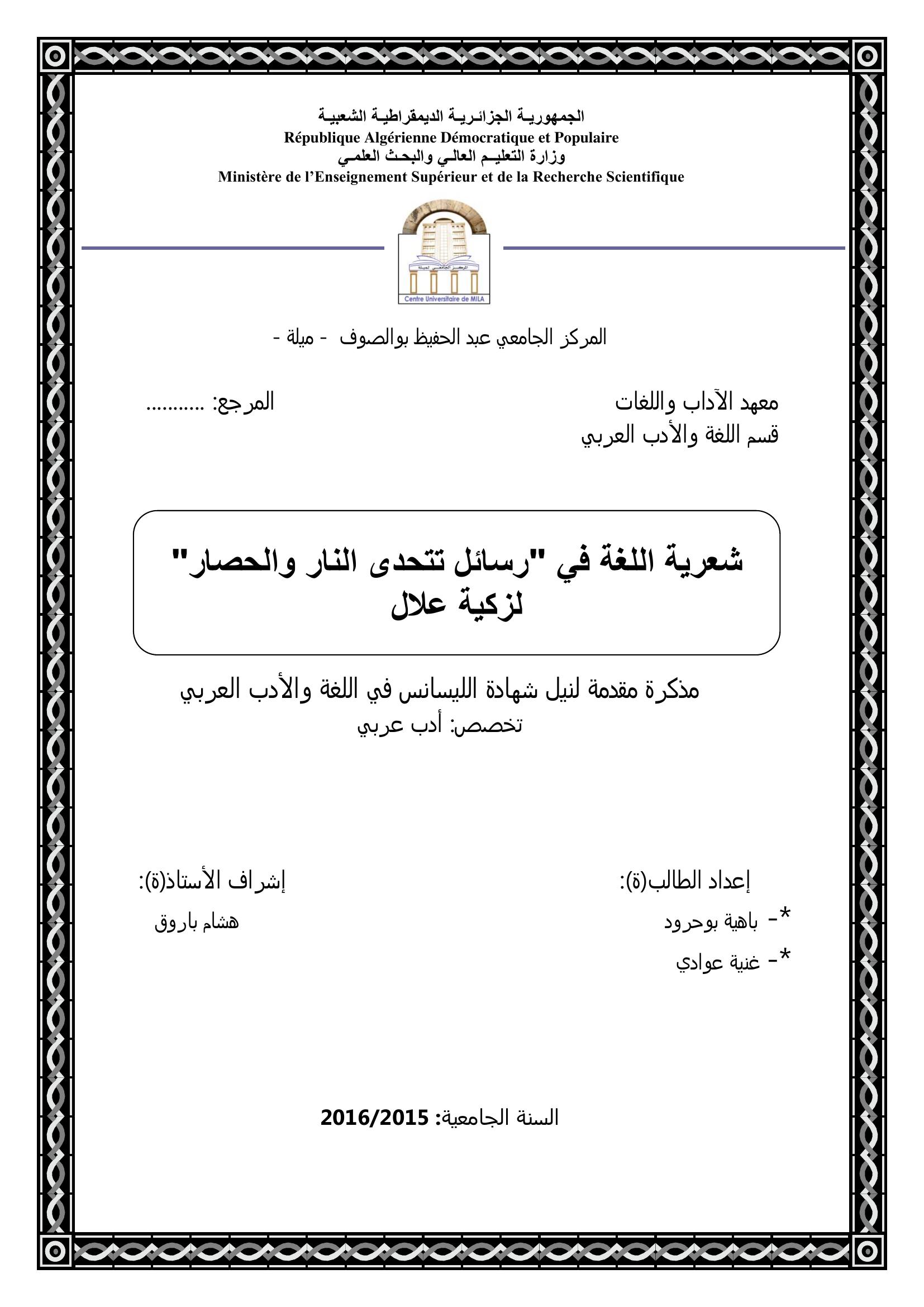 بوحرود باهية et al. (2016). شعرية اللغة في رسائل تتحدى النار و الحصار لزكية علال.