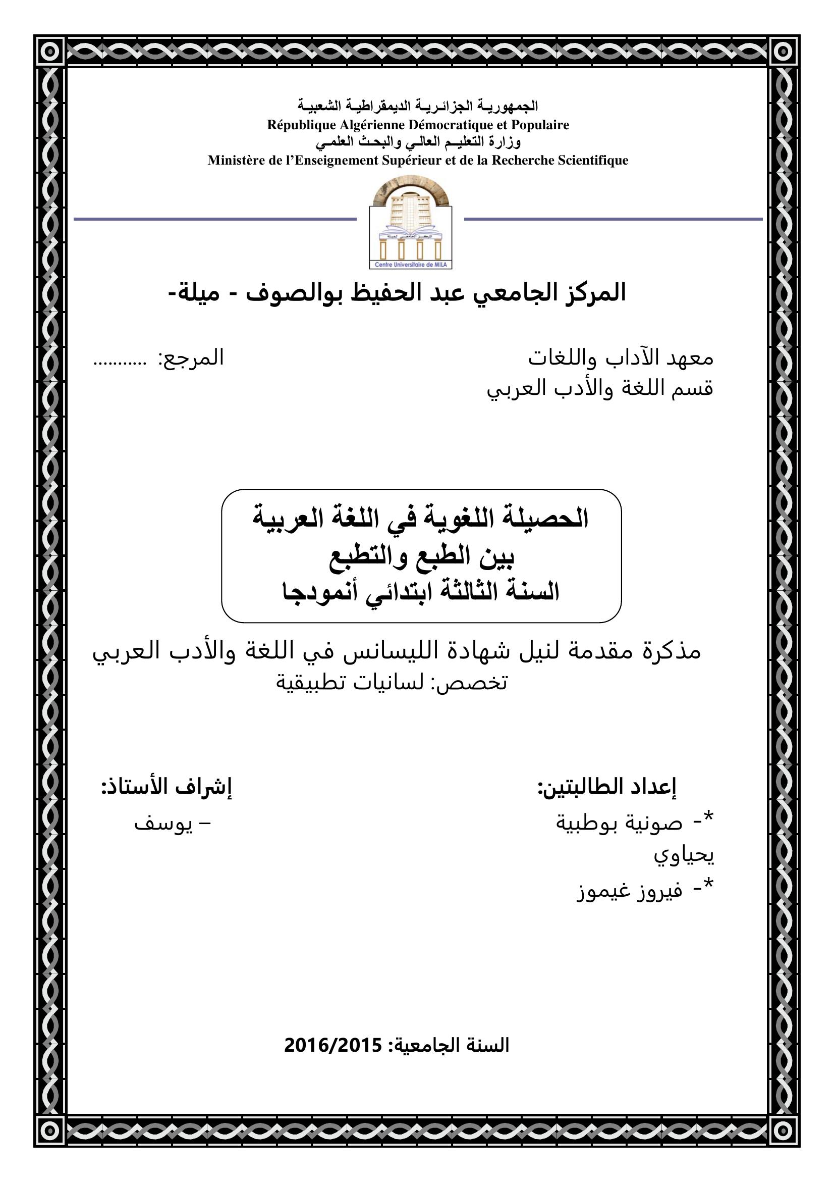 بوطبية صونية & يحياوي يوسف (مشرفا) (2016). الحصيلة اللغوية في اللغة العربية بين الطبع والتطبع السنة الثالثة إبتدائي أنموذجا.