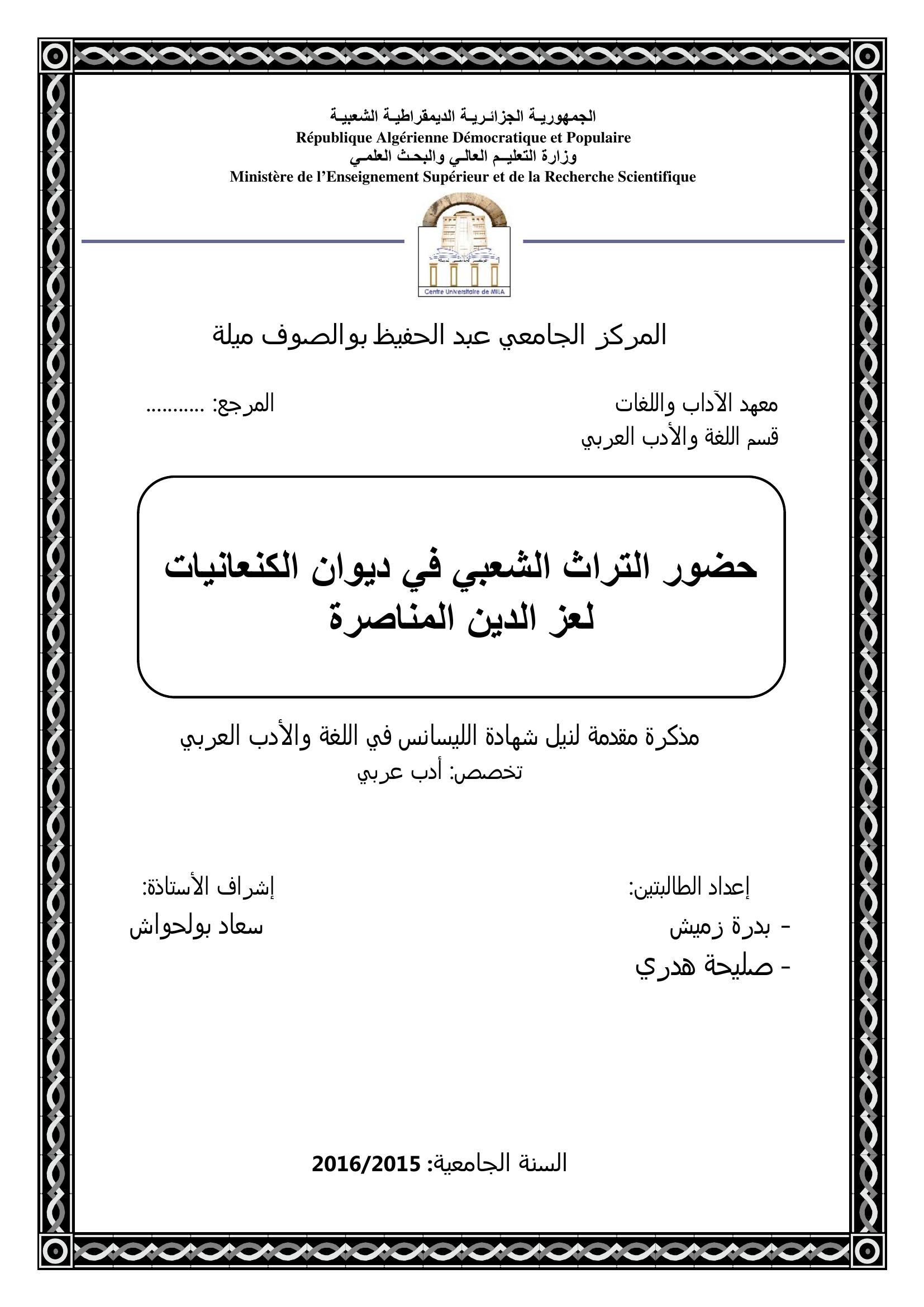 زميش بدرة et al. (2016). حضور التراث الشعبي في ديوان الكنعانيات لعز الدين المناصرة.