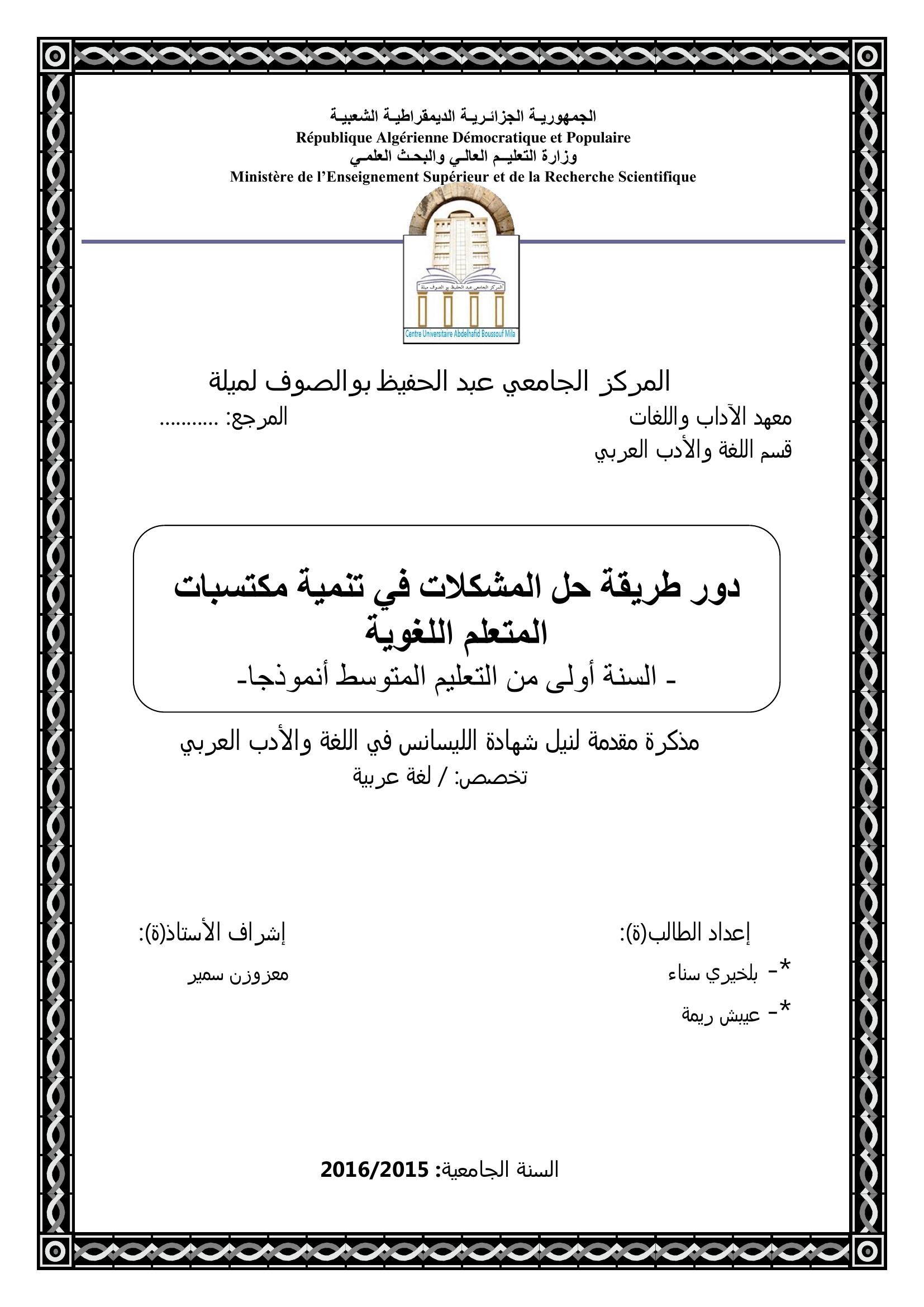 بلخيري سناء & معزوزن سمير (مشرفا) (2016). دور طريقة حل المشكلات في تنمية مكتسبات المتعلم اللغوية السنة أولى من التعليم المتوسط أنموذجا.