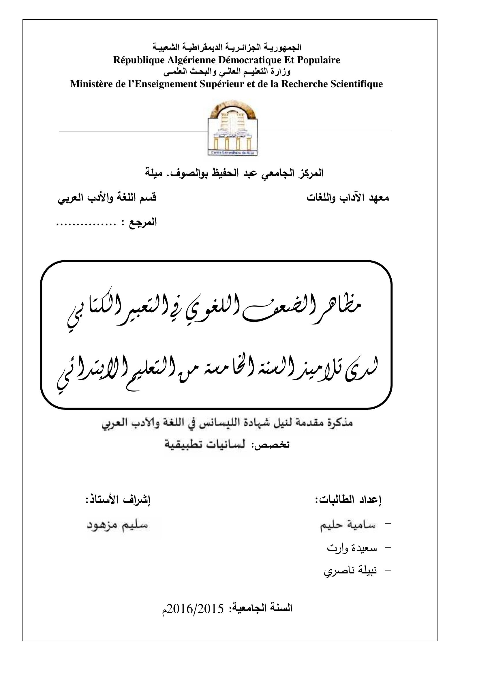 حليم سامية et al. (2016). مظاهر الضعف اللغوي في التعبير الكتابي لدى تلاميذ السنة الخامسة من التعليم الإبتدائي.