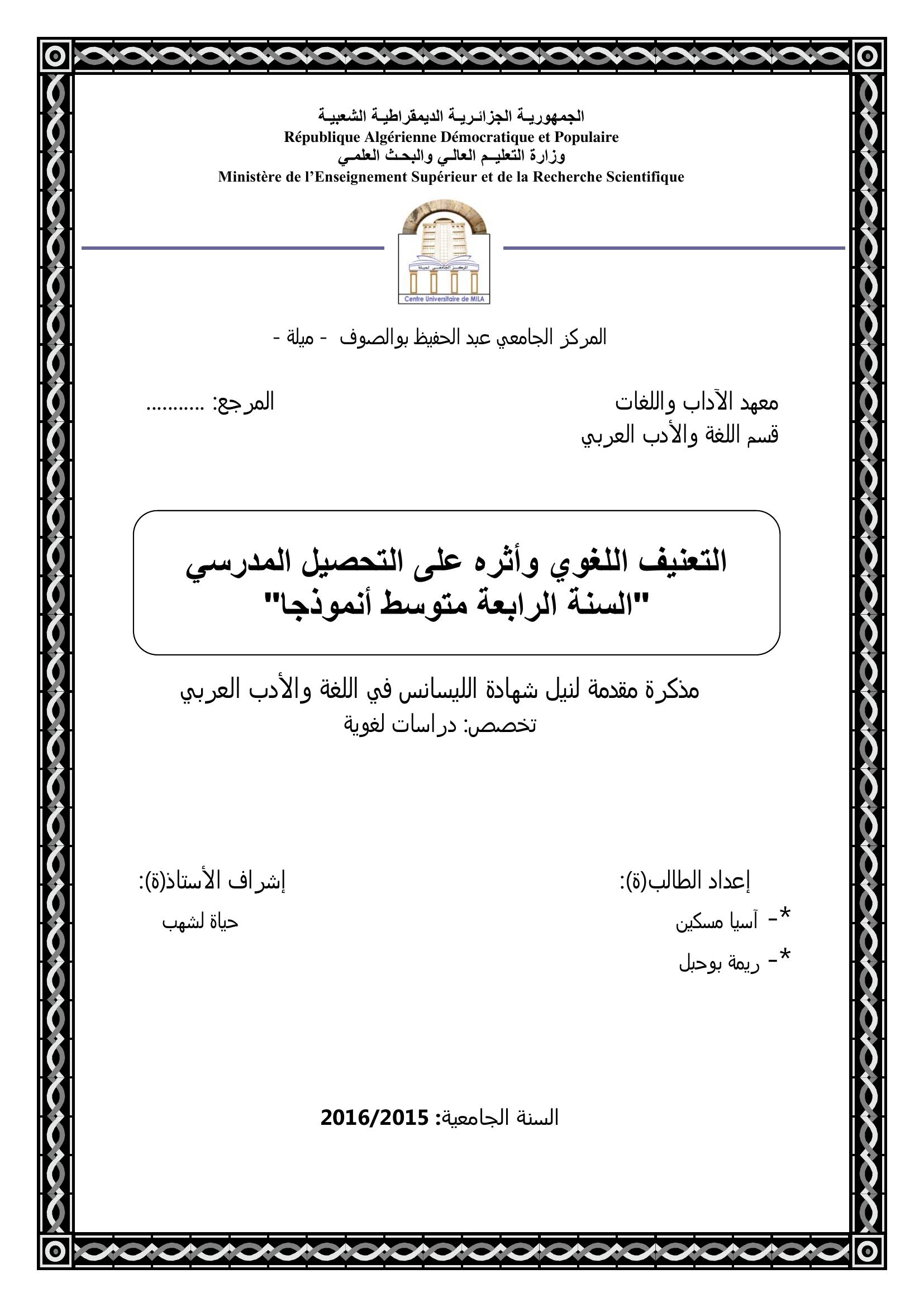 مسكين آسيا et al. (2016). التعنيف اللغوي وأثره على التحصيل المدرسي "السنة الرابعة متوسط أنموذجا ".