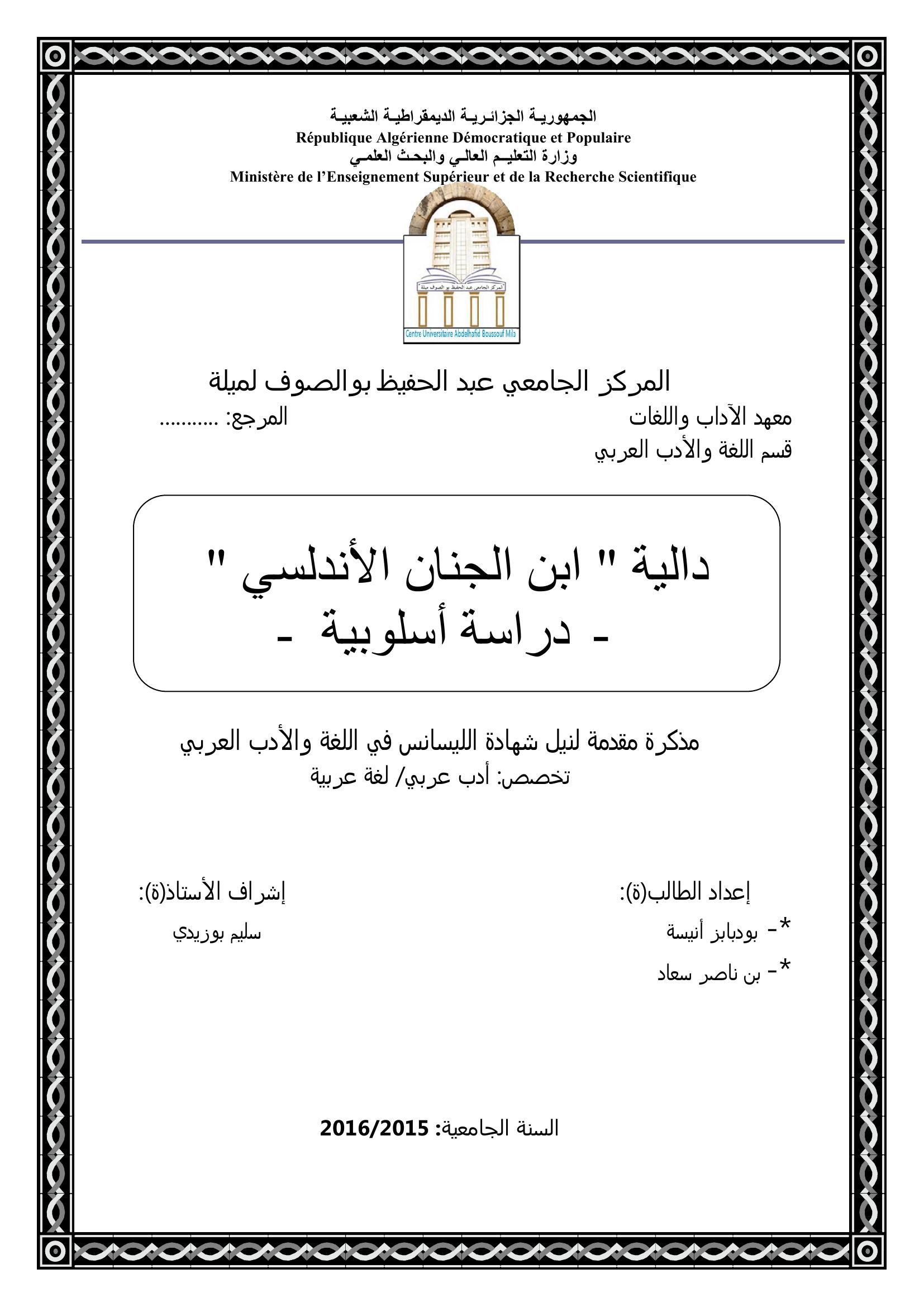 بودبابز أنيسة et al. (2016). دالية "ابن الجنان الأندلسي " دراسة أسلوبية.