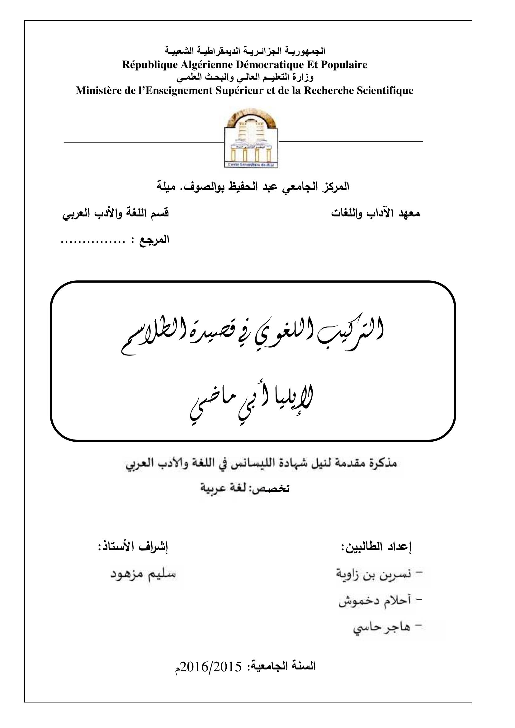 بن زاوية نسرين et al. (2016). التركيب اللغوي في قصيدة الطلاسم لإيليا أبي ماضي.