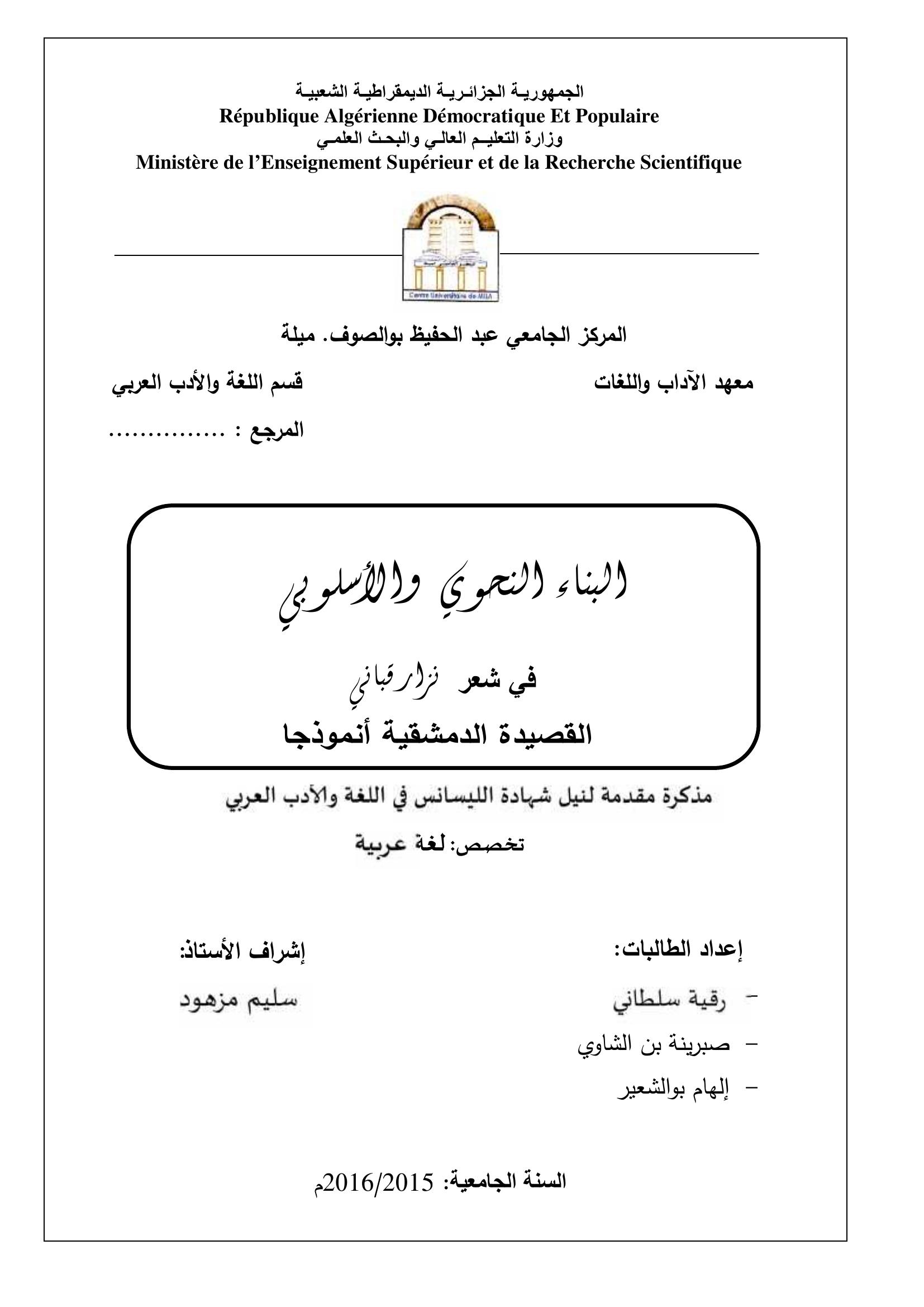 سلطاني رقية et al. (2016). البناء النحوي والاسلوبي في شعر نزار قباني القصيدة الدمشقية أنموذجا.