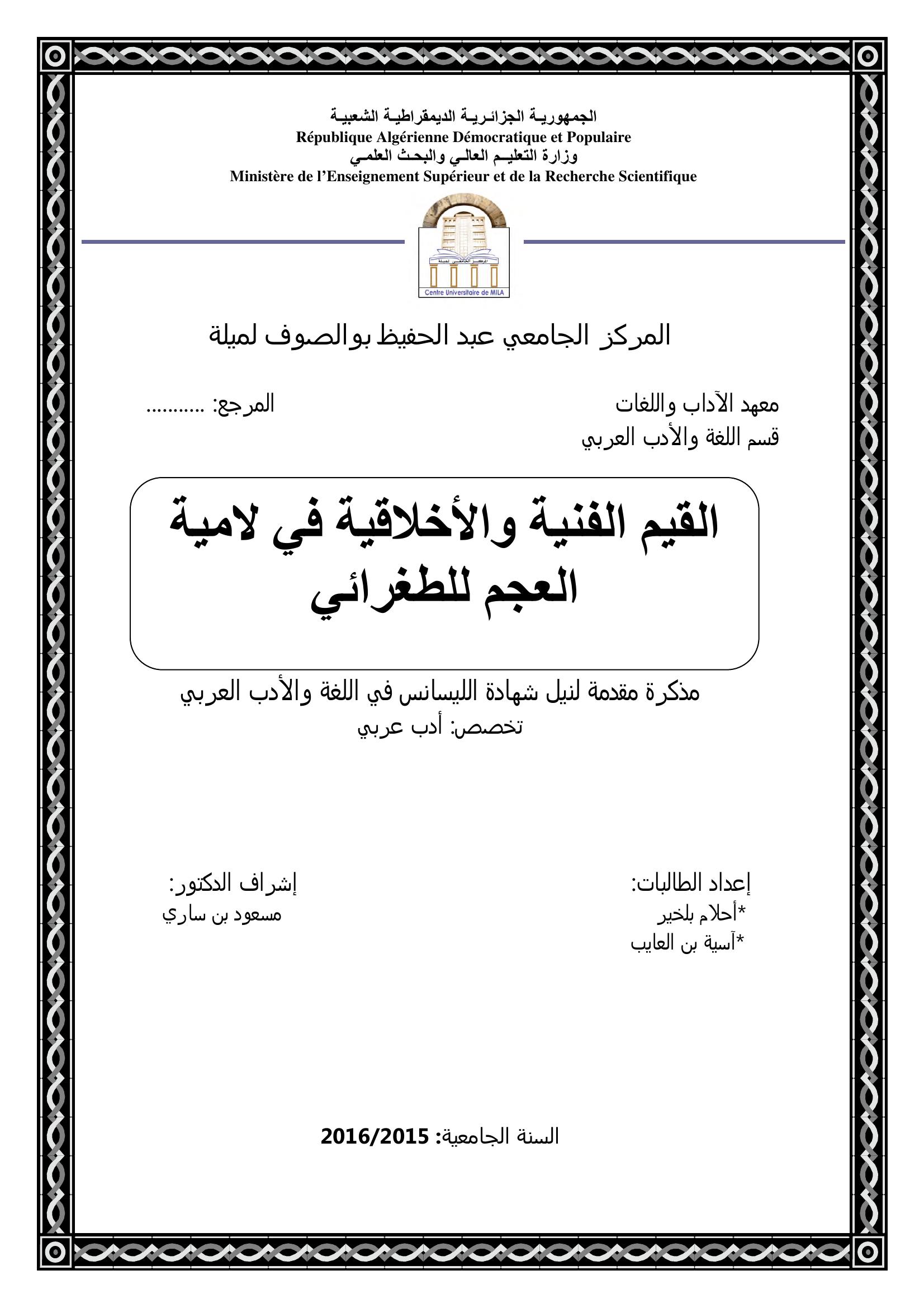 بلخير أحلام et al. (2016). القيم الفنية والأخلاقية في لامية العجم للطغرائي.