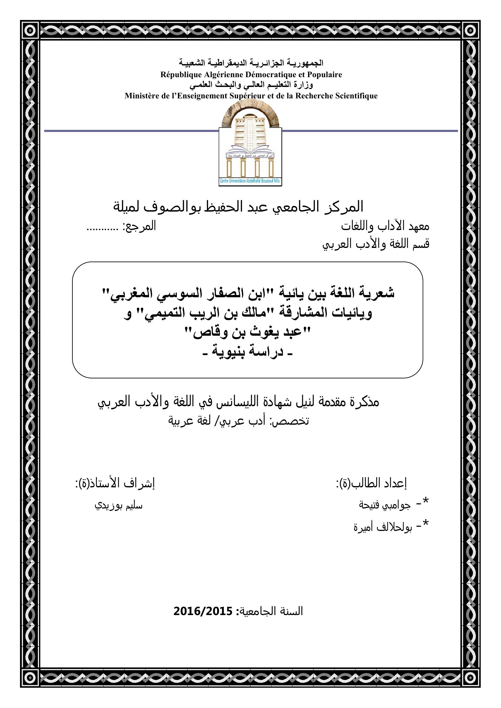 جوامبي فتيحة et al. (2016). شعرية اللغة بين يائية ابن صفار السوسي المغربي ويائيات المشارقة مالك بن الريب التميمي وعبد يغوث بن وقاص دراسة بنيوية.