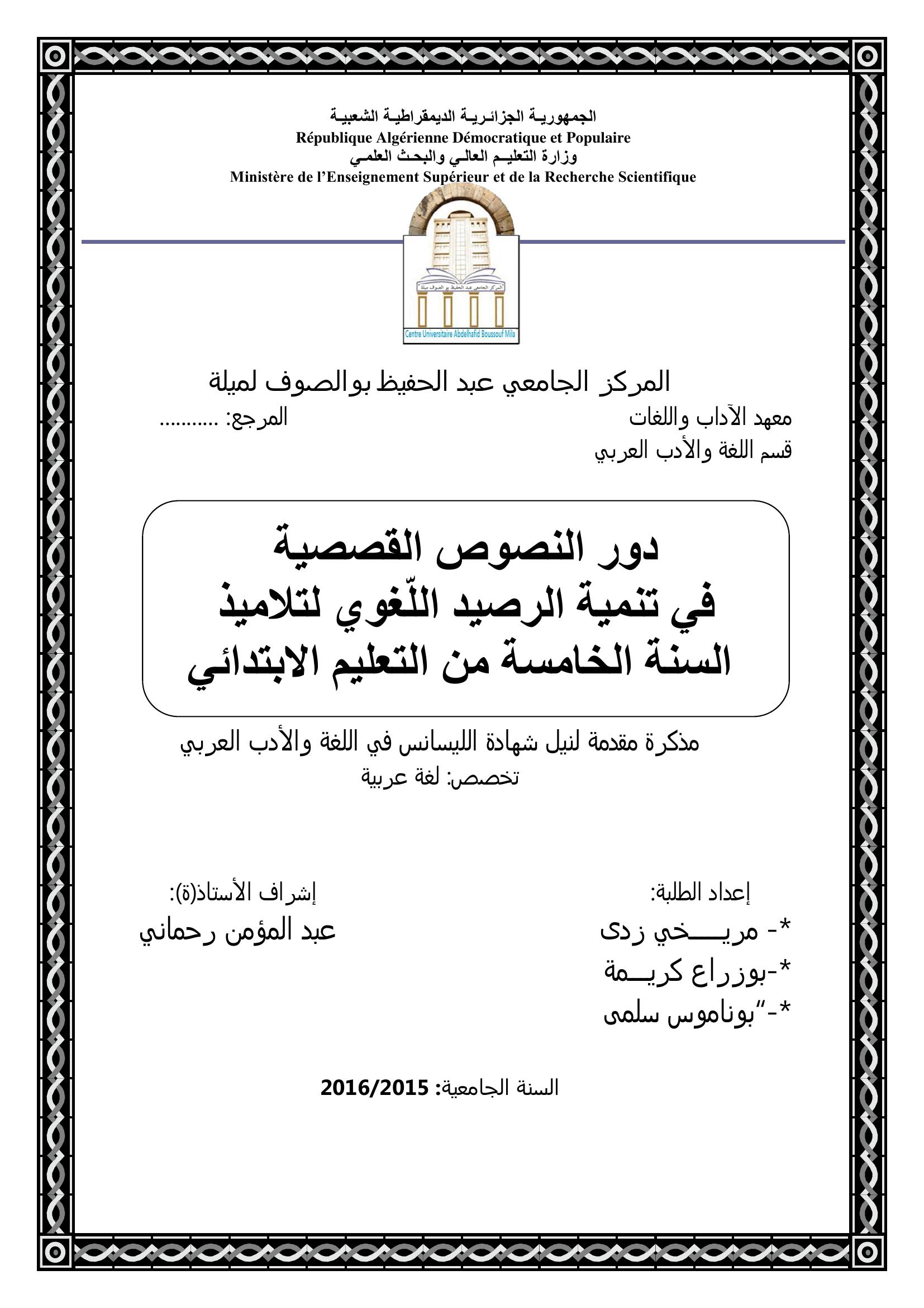 مريخي زدى et al. (2016). دور النصوص القصصية في تنمية الرصيد اللغوي لتلاميذ السنة الخامسة من التعليم الإبتدائي.