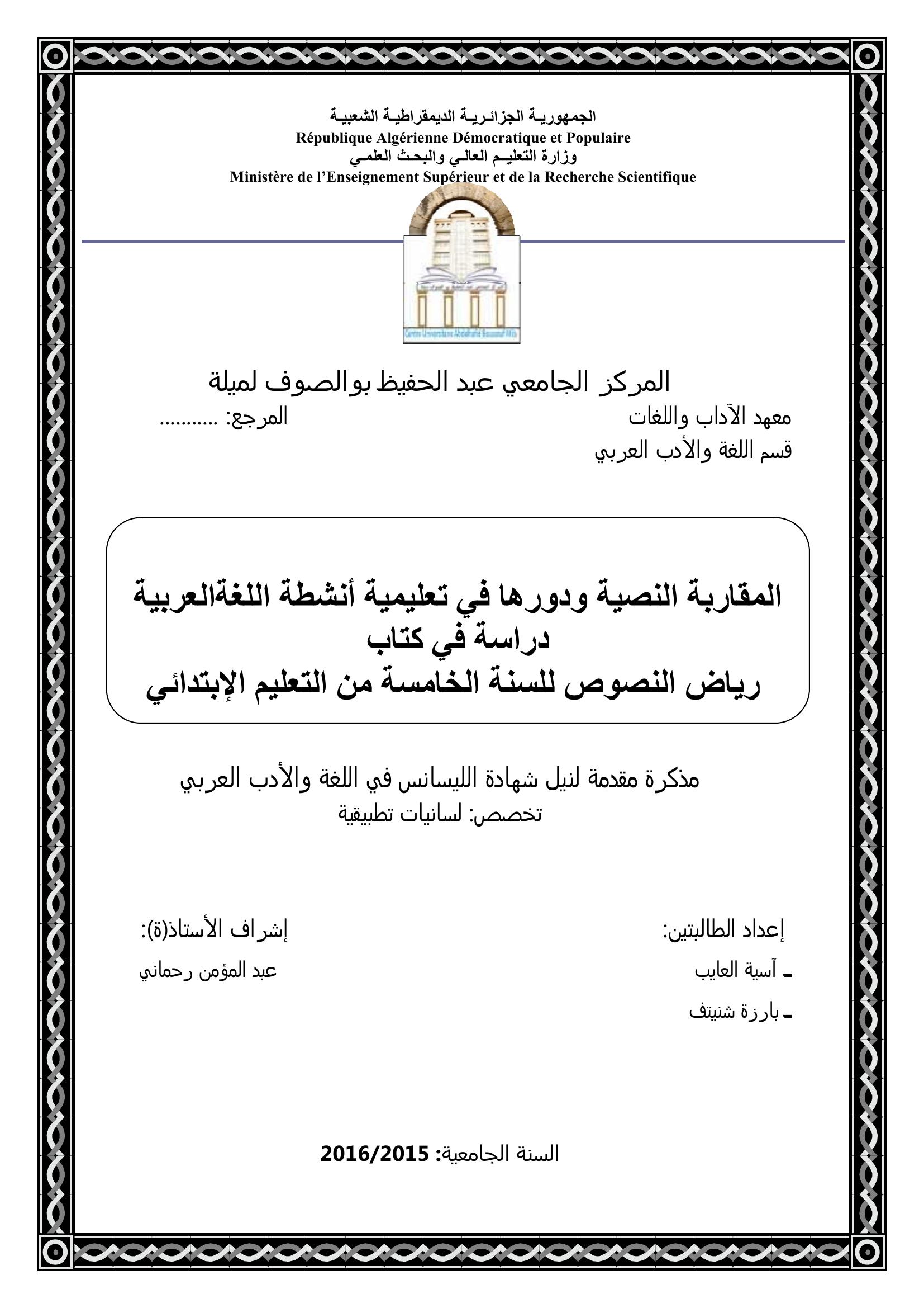 العايب آسية et al. (2016). المقاربة النصية ودورها في تعليمية أنشطة اللغة العربية دراسة في كتاب رياض النصوص للسنة الخامسة من التعليم الإبتدائي.