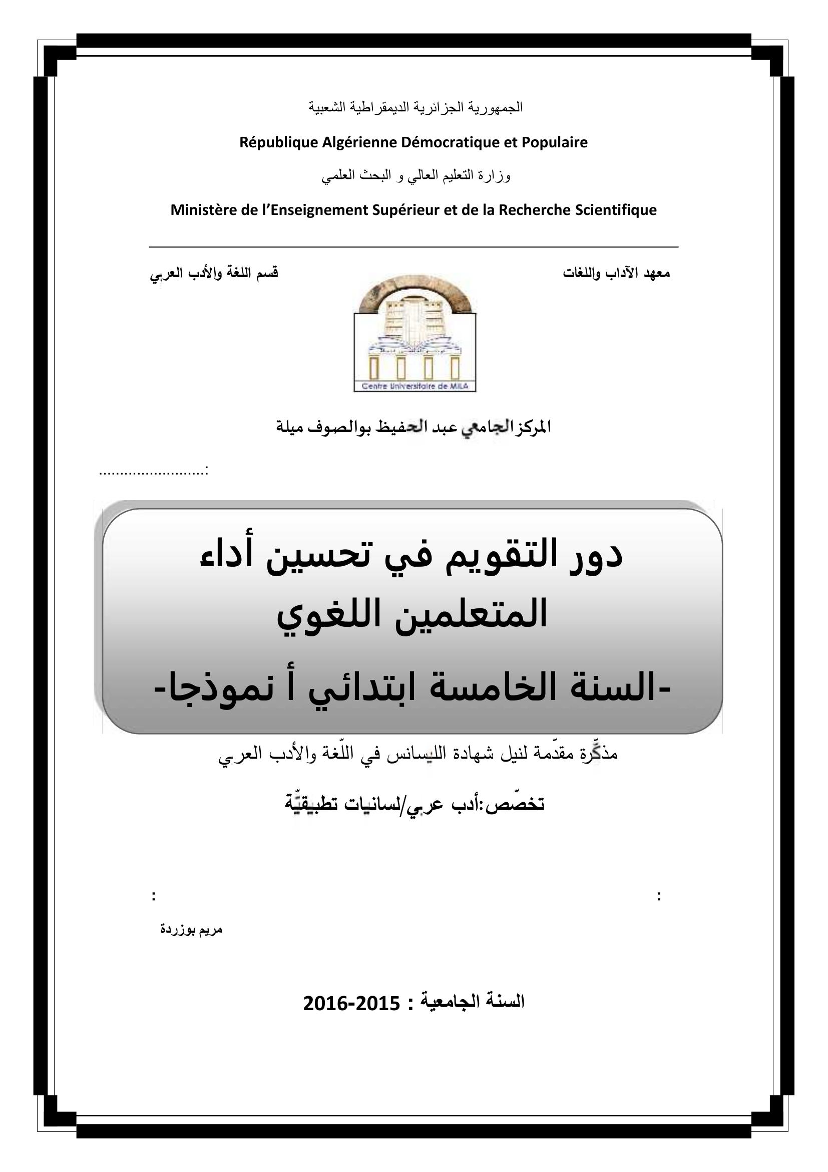بن كروم حنان & بوزردة مريم (مشرفا) (2016). دور التقويم في تحسين أداء المتعلمين اللغوي السنة الخامسة إبتدائي أنموذجا.
