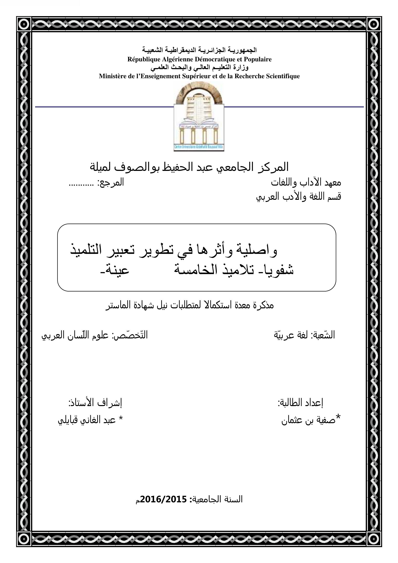 بن عثمان صفية & قبايلي عبد الغاني (مشرفا) (2016). الملكة التواصلية وأثرها في تطوير تعبير التلميذ شفويا تلاميذ الخامسة إبتدائي عينة.