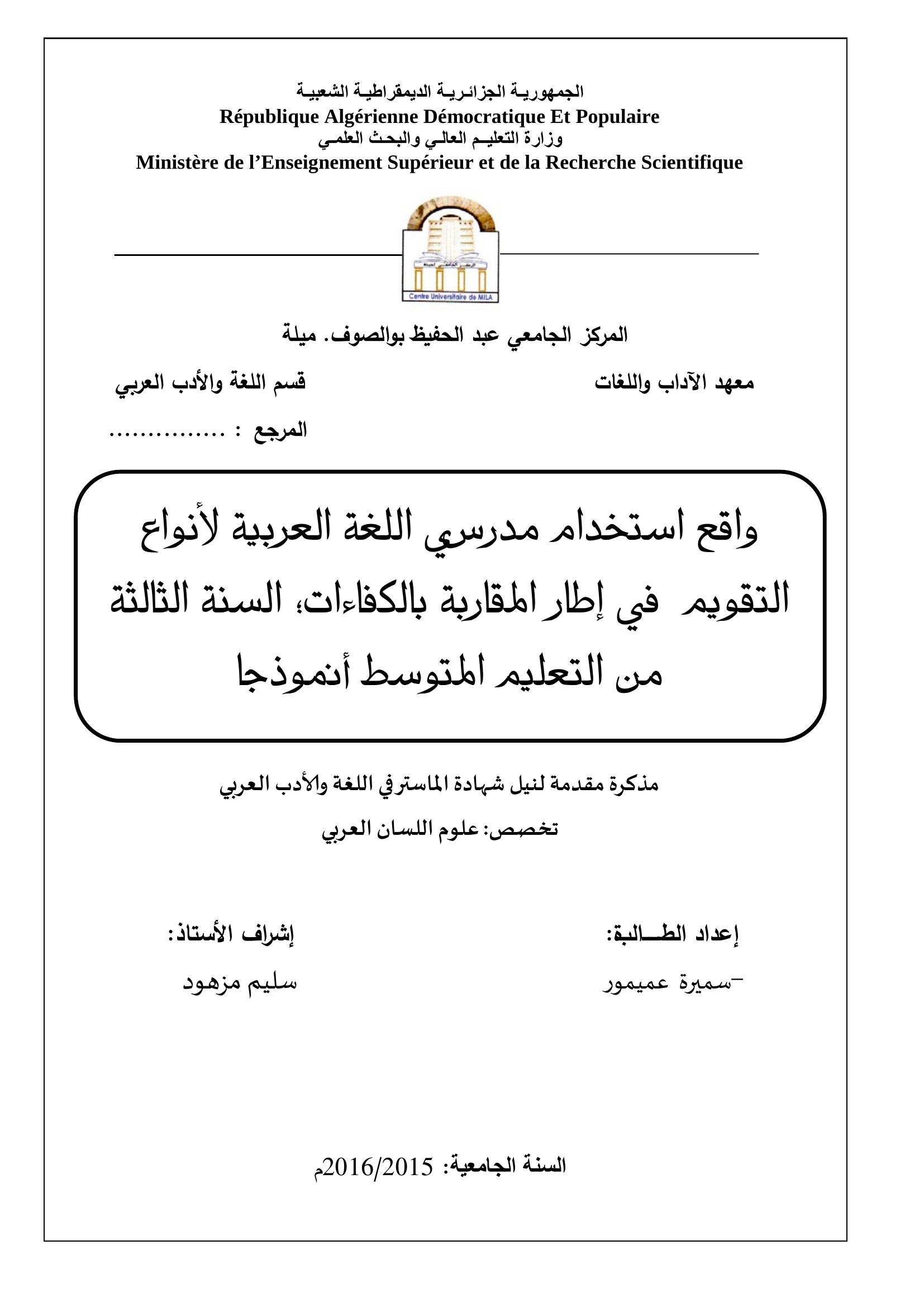 عميمور سميرة & مزهود سليم (مشرفا) (2016). واقع إستخدام مدرسي اللغة العربية لأنواع التقويم في إطار المقاربة بالكفاءات السنة الثالثة من التعليم المتوسط أنموذجا.