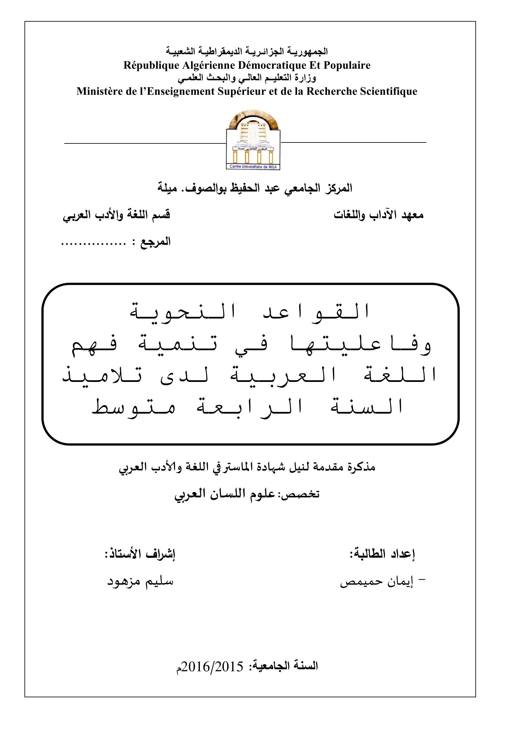 حميمص إيمان & مزهود سليم (مشرفا) (2016). القواعد النحوية وفاعليتها في تنمية فهم اللغة العربية لدى تلاميذ السنة الرابعة متوسط.