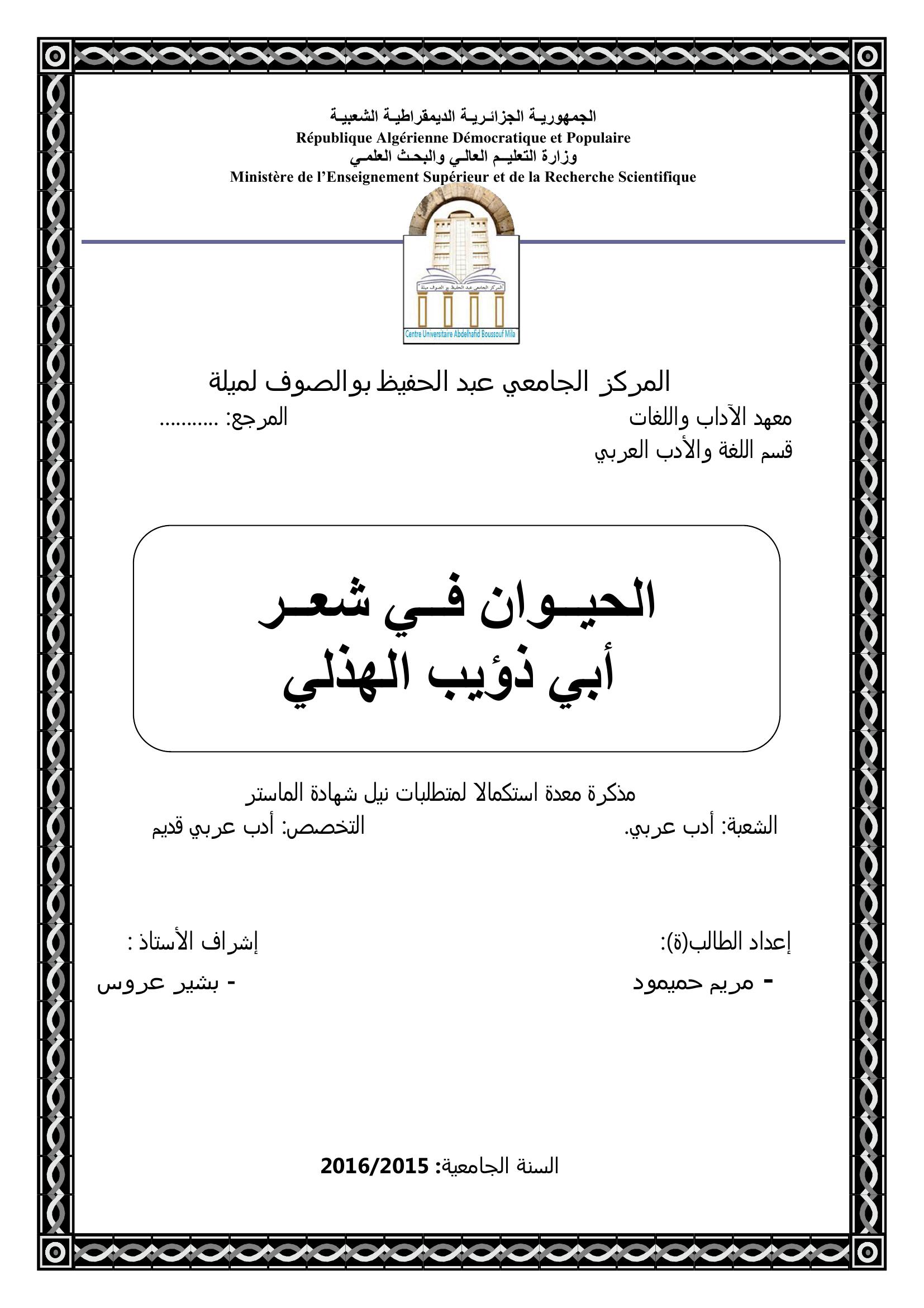 حميمود مريم & عروس بشير(مشرفا) (2016). الحيوان في شعر أبي ذؤيب الهذلي.