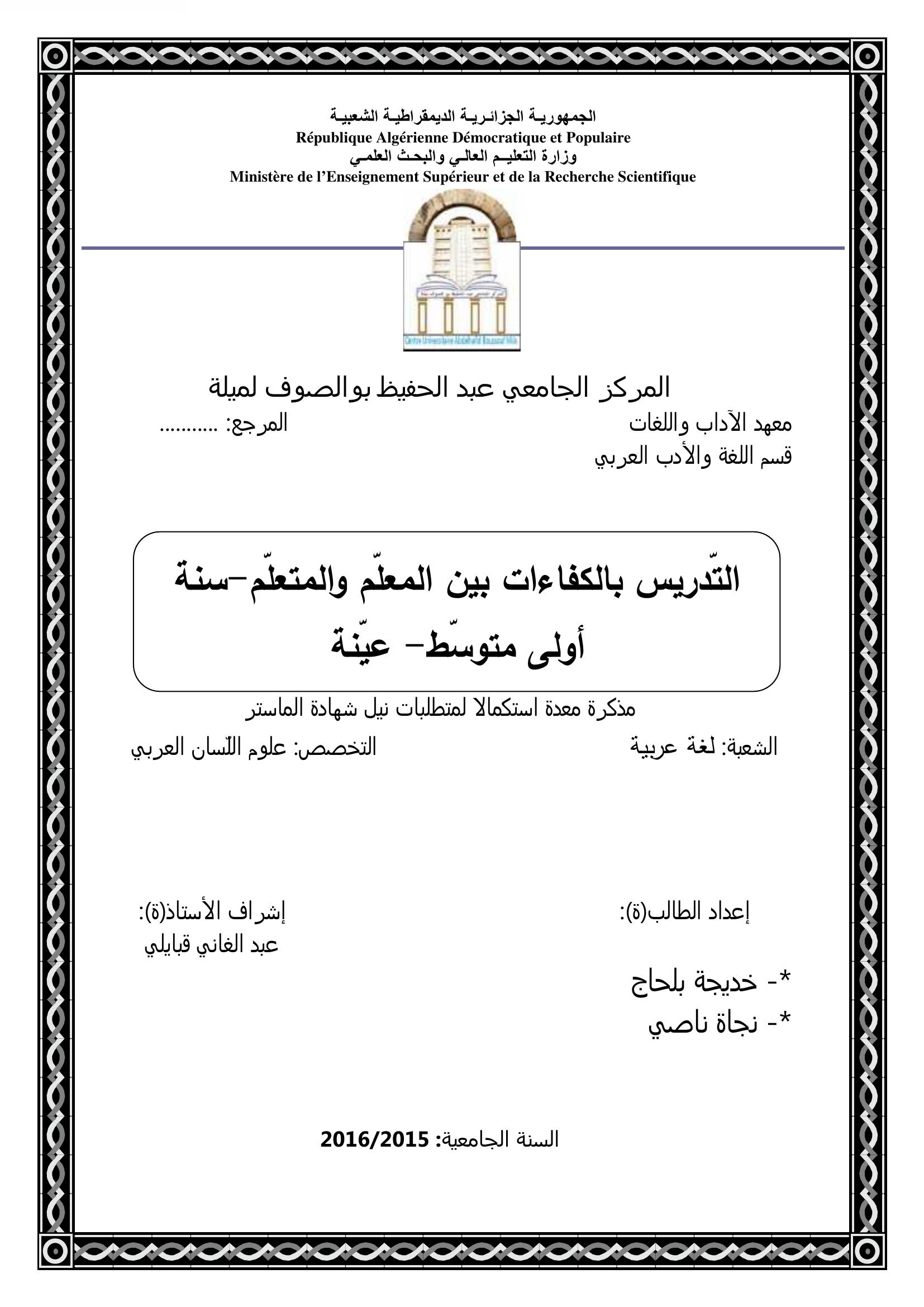 بلحاج خديجة & قبايلي عبد الغاني (مشرفا) (2016). التدريس بالكفاءات بين المعلم والمتعلم سنة أولى متوسط عينة.