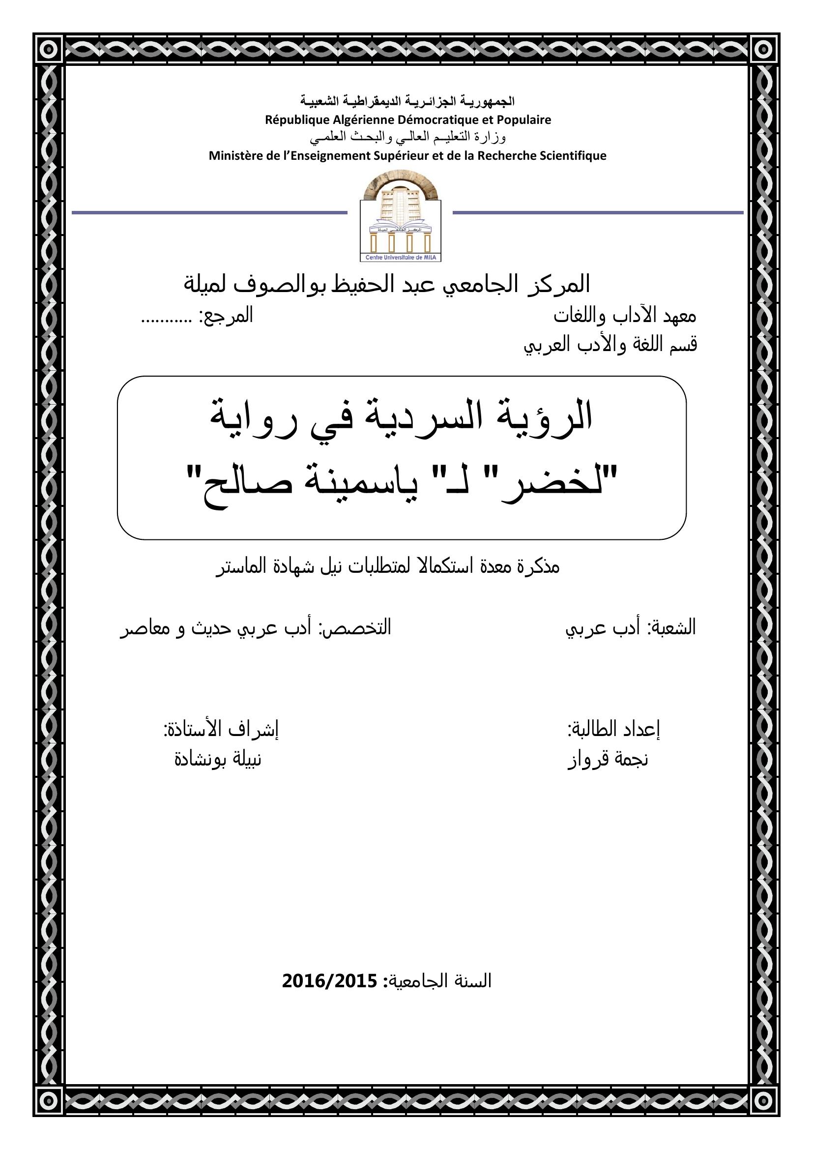 قرواز نجمة & بونشادة نبيلة (مشرفا) (2016). الرؤية السردية في رواية " لخضر "لــ ياسمينة صالح".