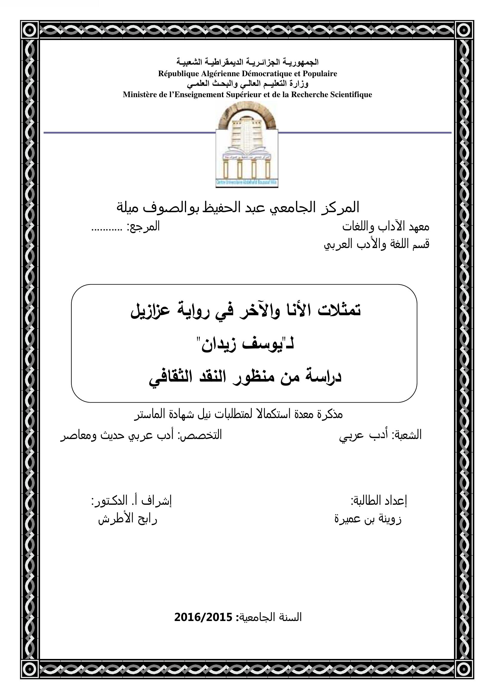بن عميرة زوينة & الأطرش رابح( مشرفا) (2016). تمثيلات الأنا والآخر في رواية عزازيل لـ" يوسف زيدان دراسة من منظور النقد الثقافي.